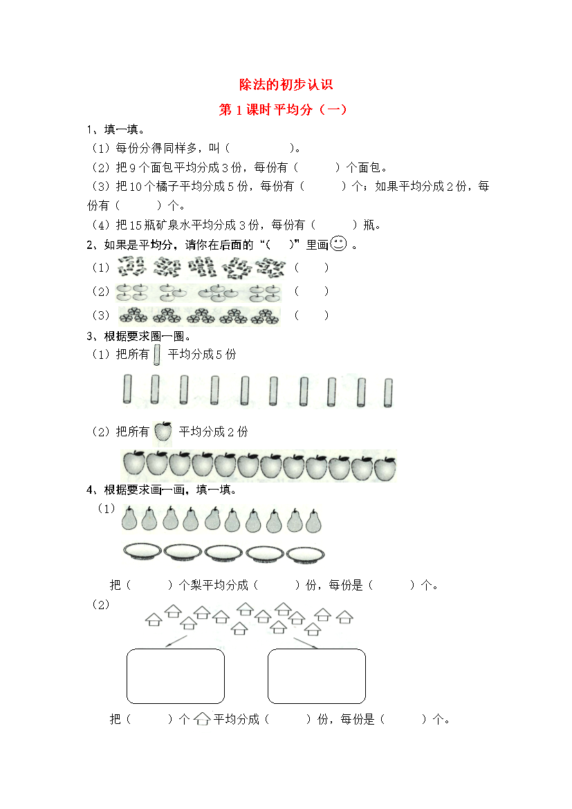试题-全国-2019_二年级数学下册 第二单元《表内除法一》除法的初步认识(第1课时平均分(一))一课一练(无答案) 新人教版