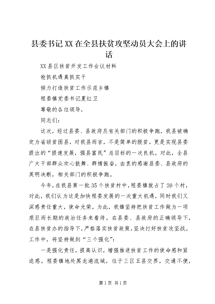 县委书记XX在全县扶贫攻坚动员大会上的讲话