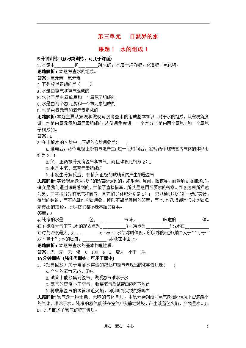 试题-全国-2010_黄冈零距离备战2011年化学中考同步创新 第三单元《自然界的水》课题1 水的组成(一)课时练习