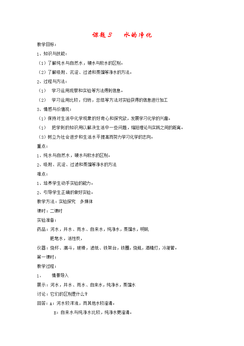 教案-全国-2010_八年级化学第四单元 自然界的水课题 水的净化教案人教版五四学制