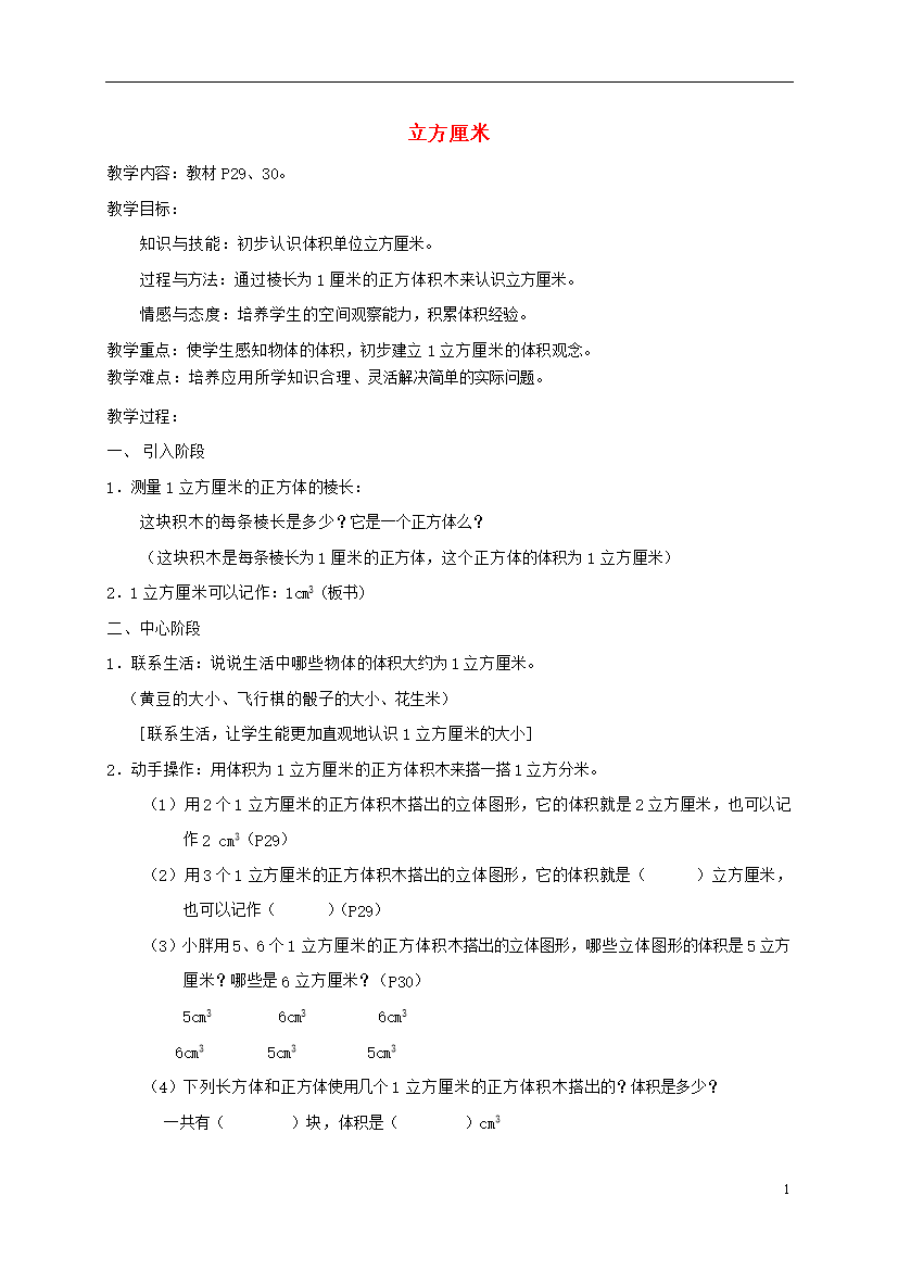 教案-全国-2012_五年级数学下册 立方厘米1教案 沪教版
