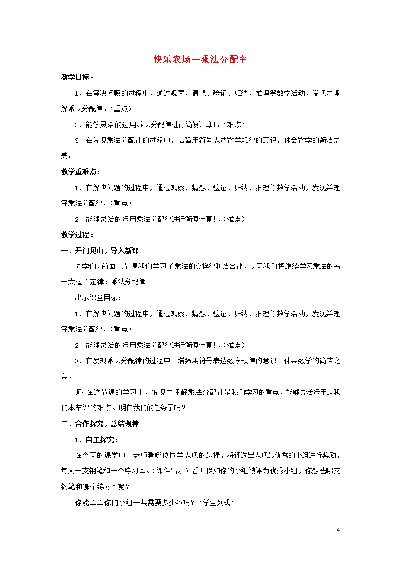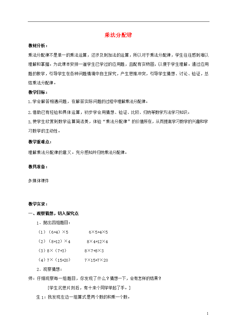 教案-全国-2011_四年级数学上册 乘法分配律 1教案 青岛版五年制