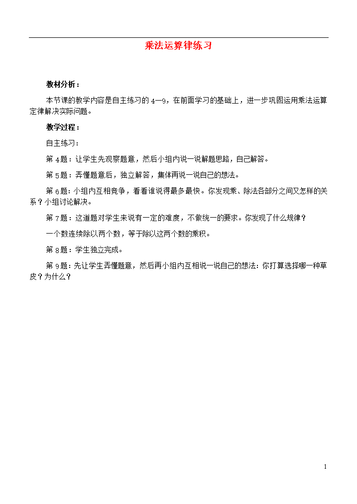 教案-全国-2013_四年级数学下册 乘法运算律练习教案 青岛版