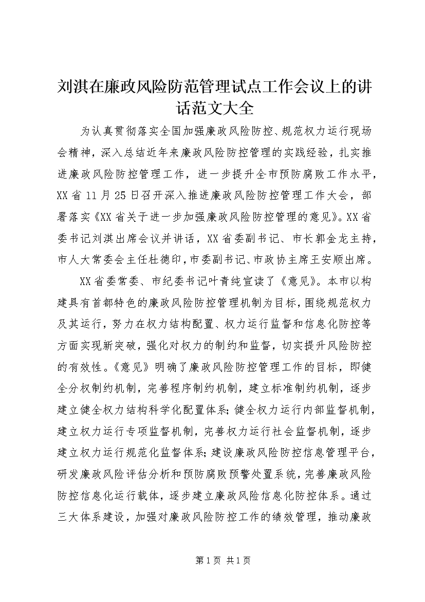 刘淇在廉政风险防范管理试点工作会议上的讲话范文大全