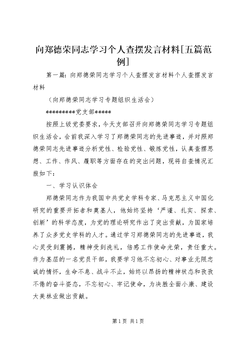 向郑德荣同志学习个人查摆发言材料[五篇范例]