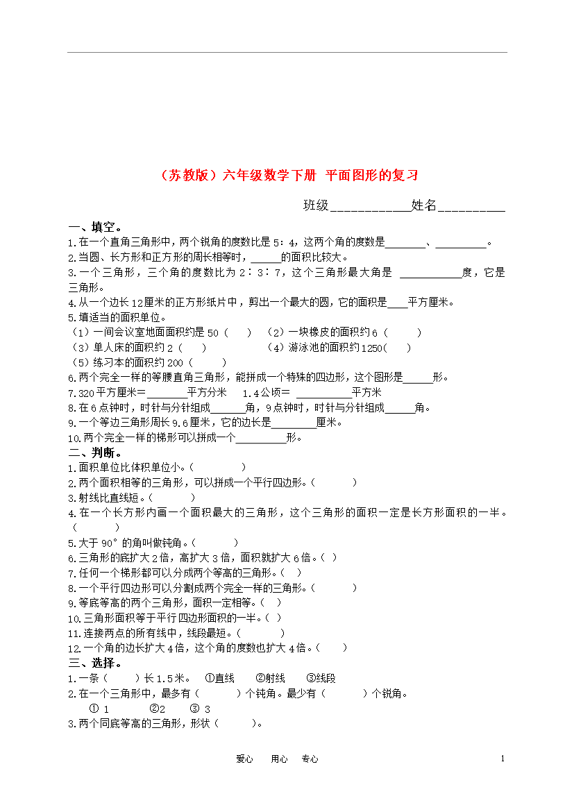 试题-全国-2011_六年级数学下册 平面图形的复习练习(无答案) 苏教版