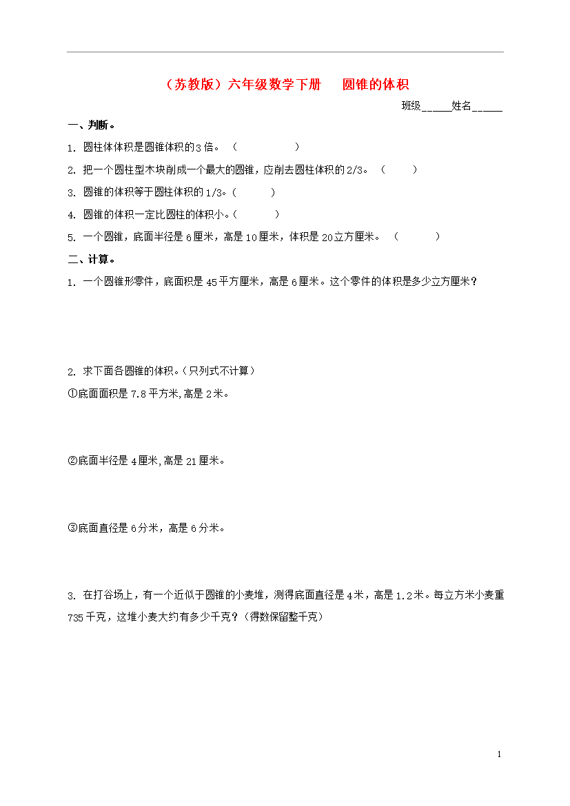 试题-全国-2011_六年级数学下册 圆锥的体积(一)练习题 苏教版