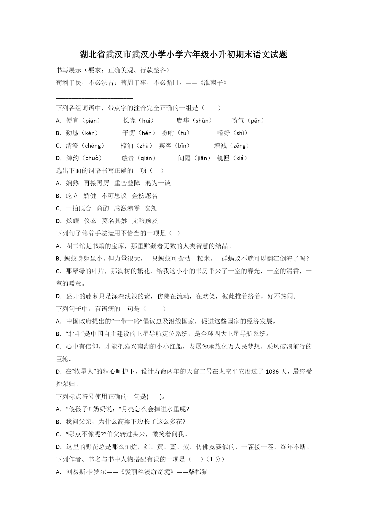 湖北省武汉市武汉小学小学六年级小升初期末语文试题