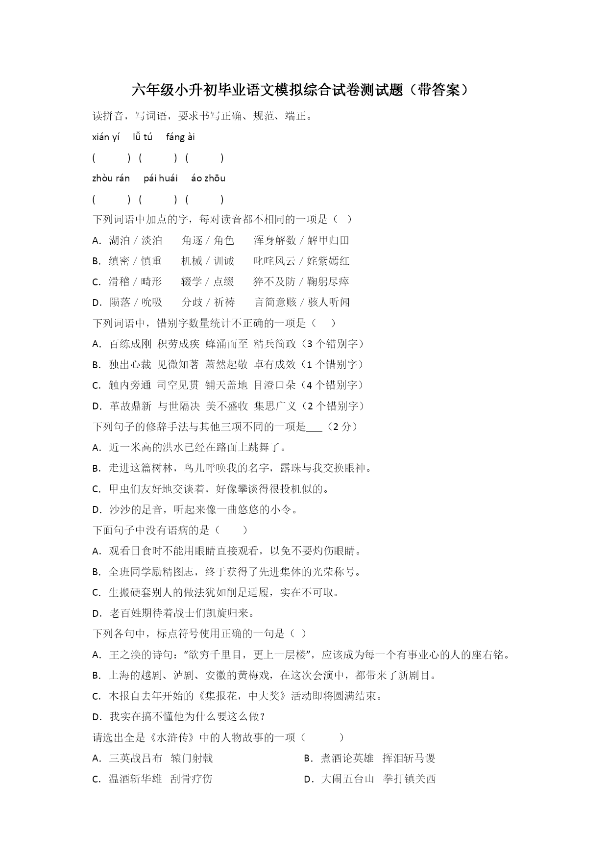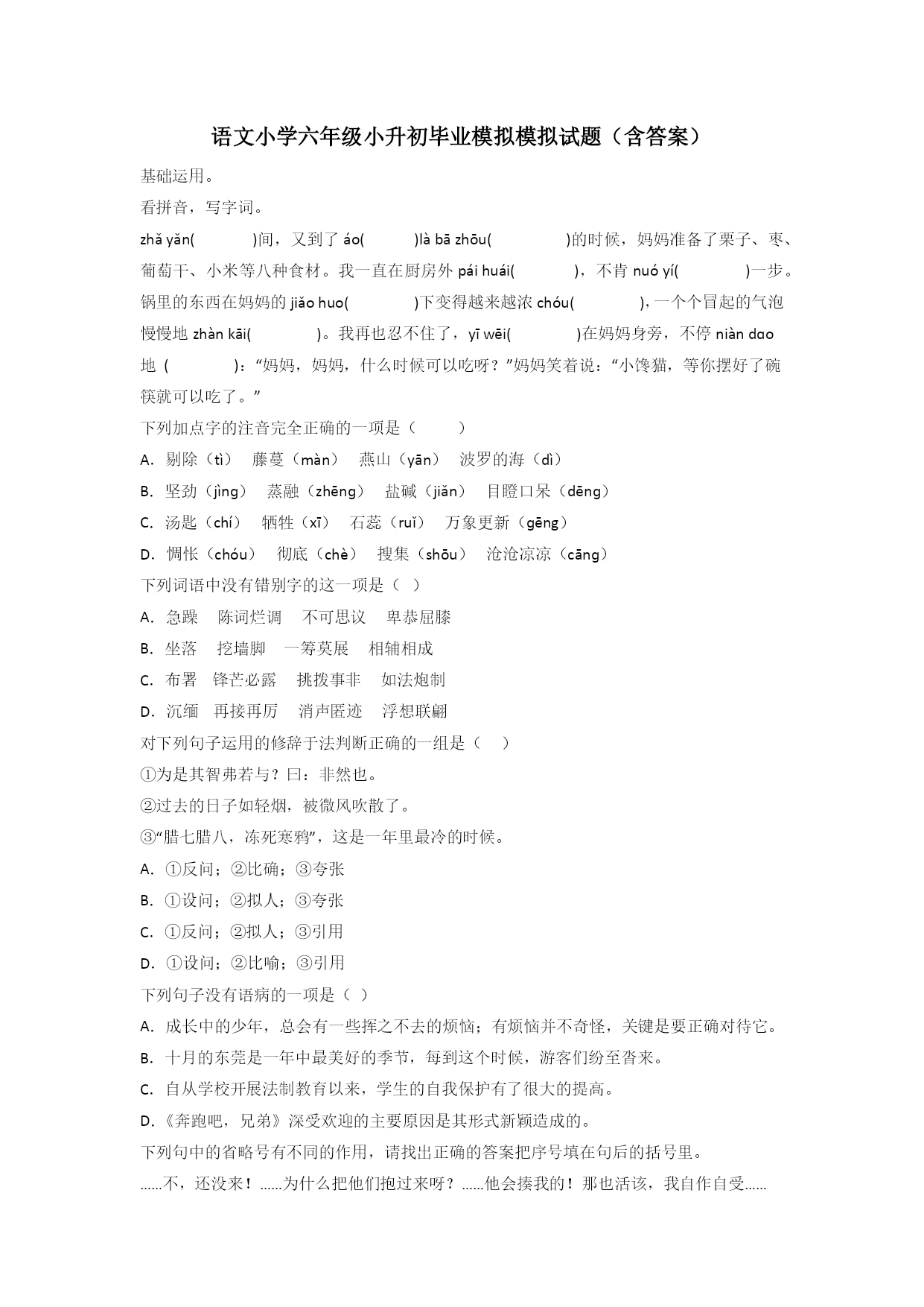 小学六年级小升初毕业语文质量提高试卷(含答案)