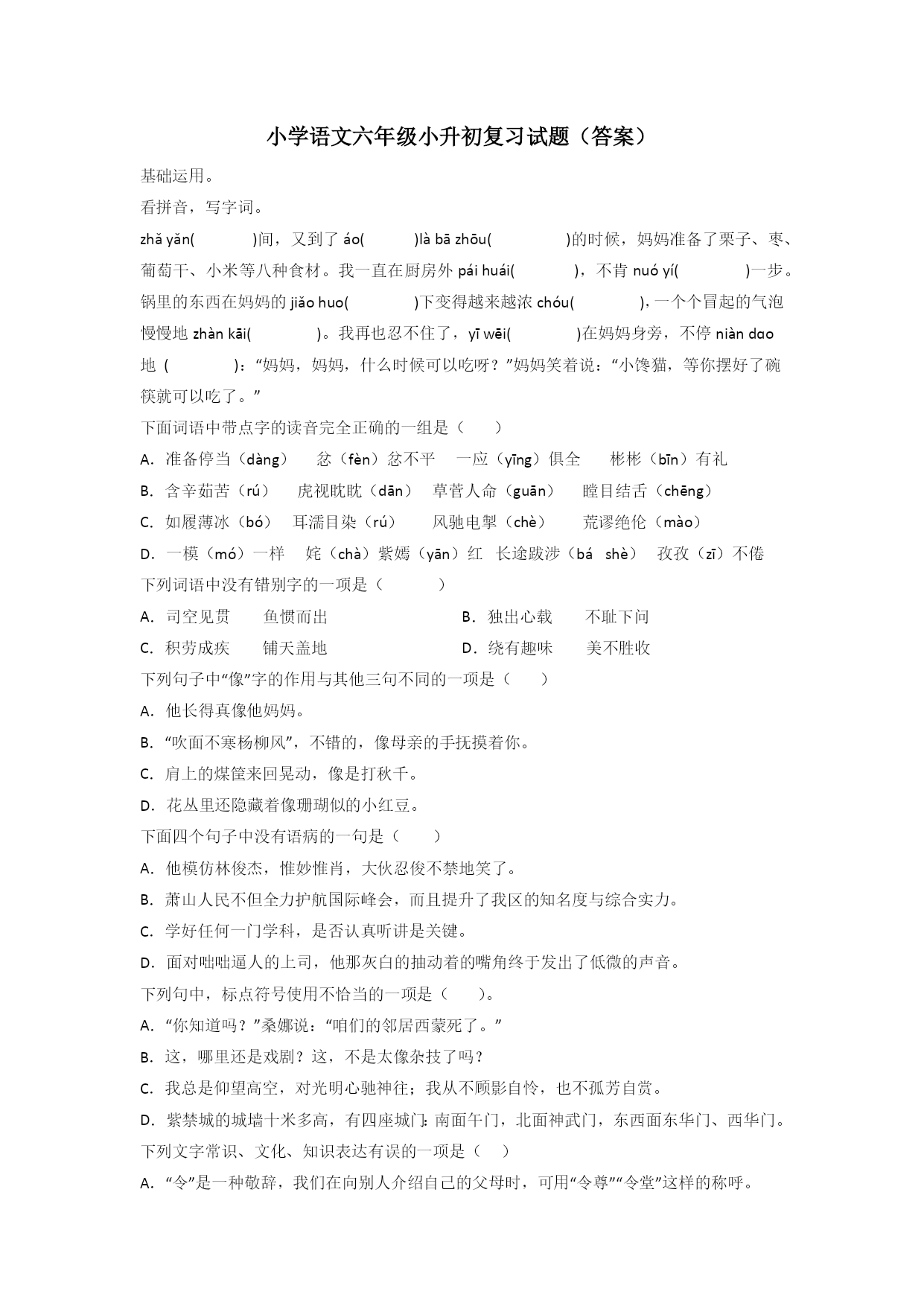 小学语文六年级小升初复习试题(答案)