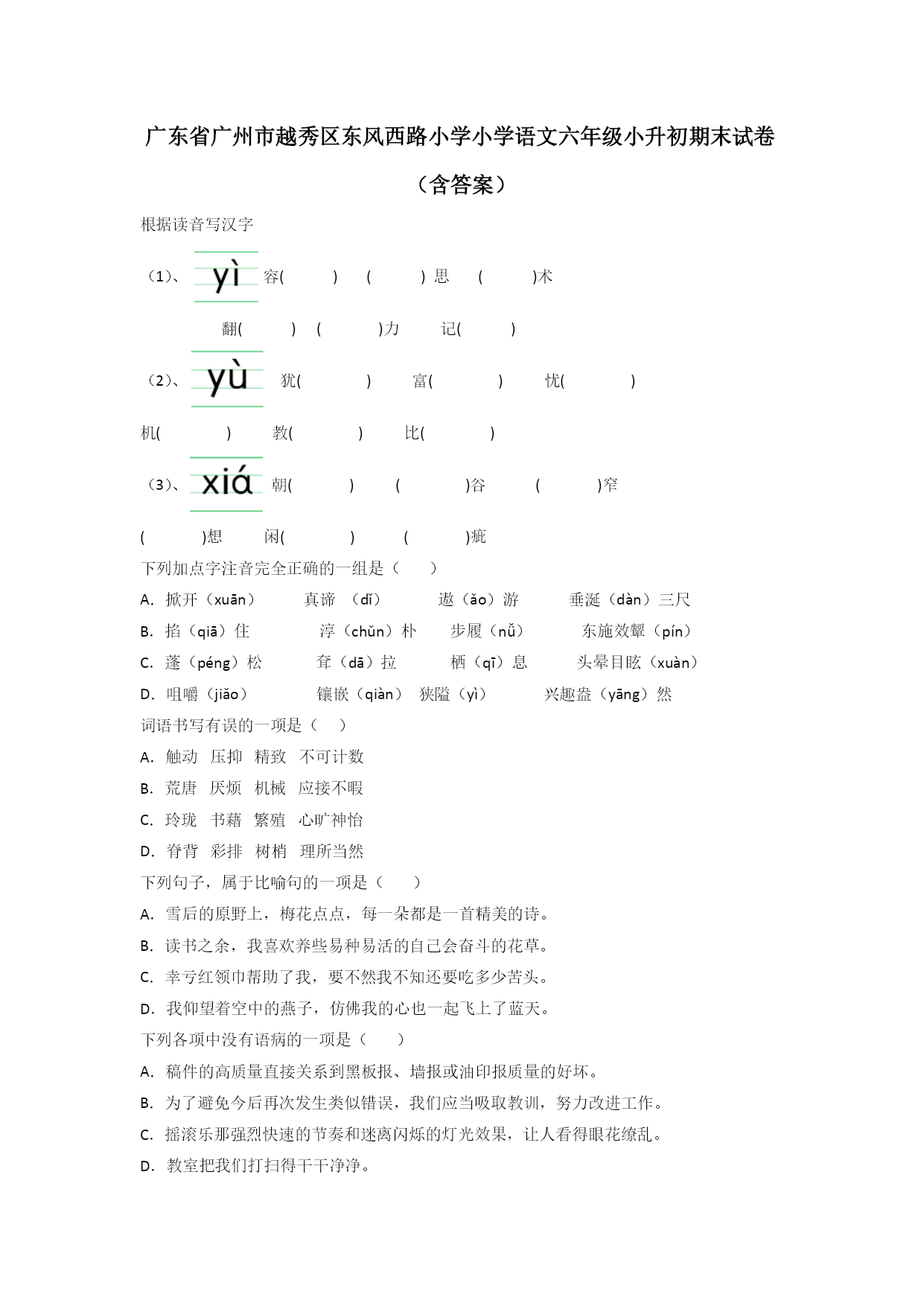 广东省广州市越秀区东风西路小学小学语文六年级小升初期末试卷(含答案)