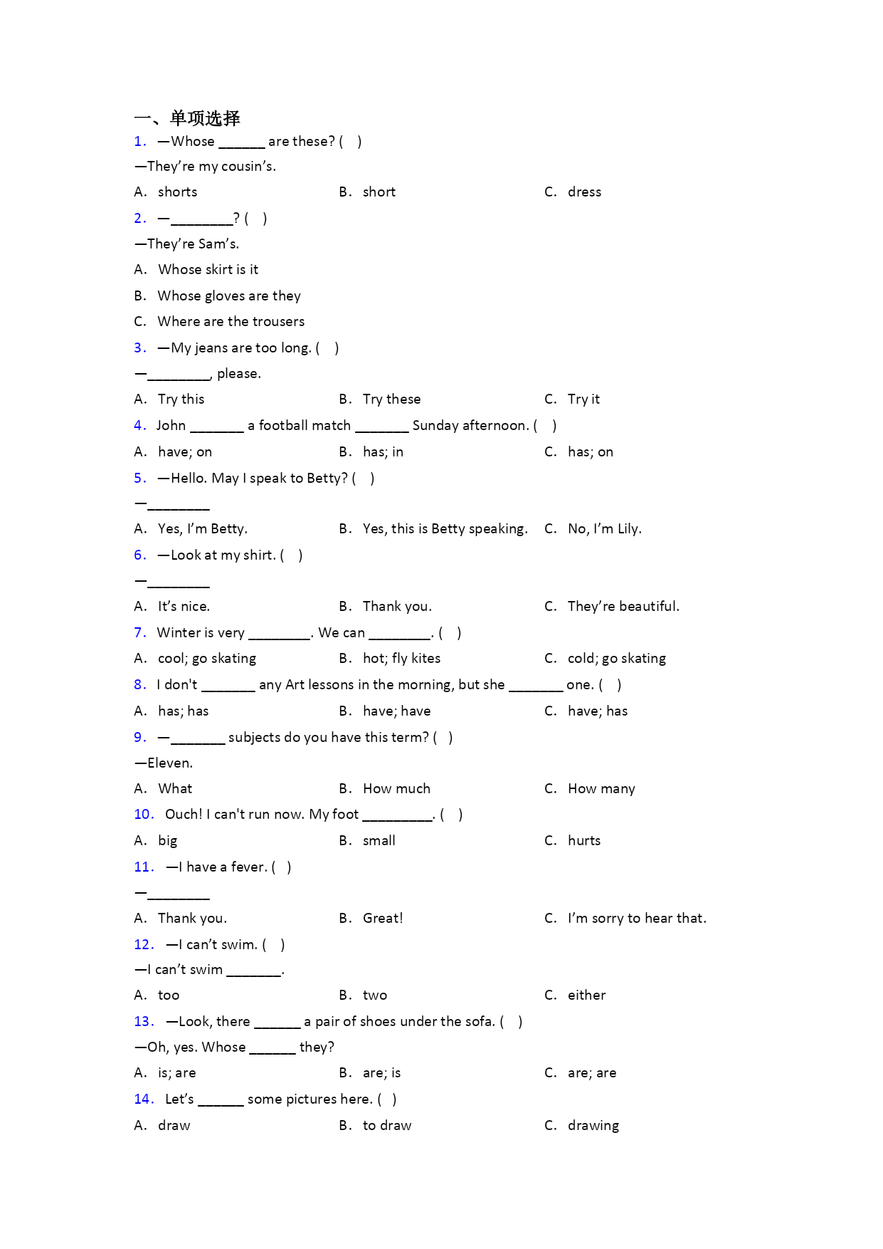 人教pep版小学英语四年级下学期期末复习综合试卷(带答案)