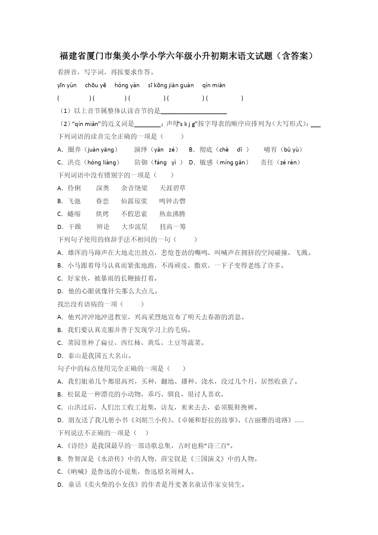 福建省厦门市集美小学小学六年级小升初期末语文试题(含答案)