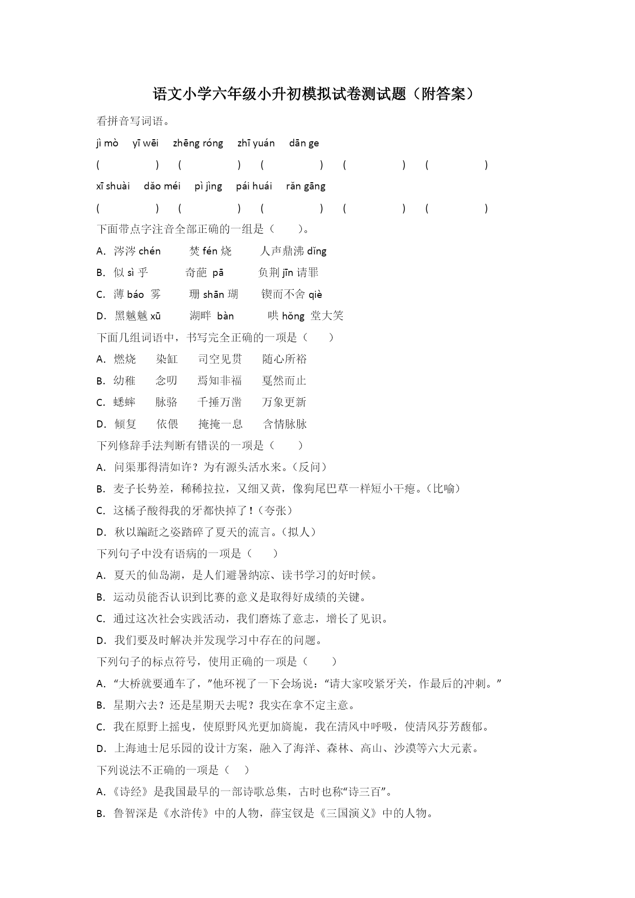 语文小学六年级小升初模拟试卷测试题(附答案)