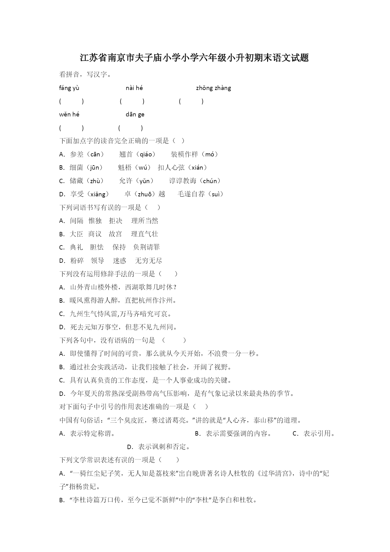 江苏省南京市夫子庙小学小学六年级小升初期末语文试题