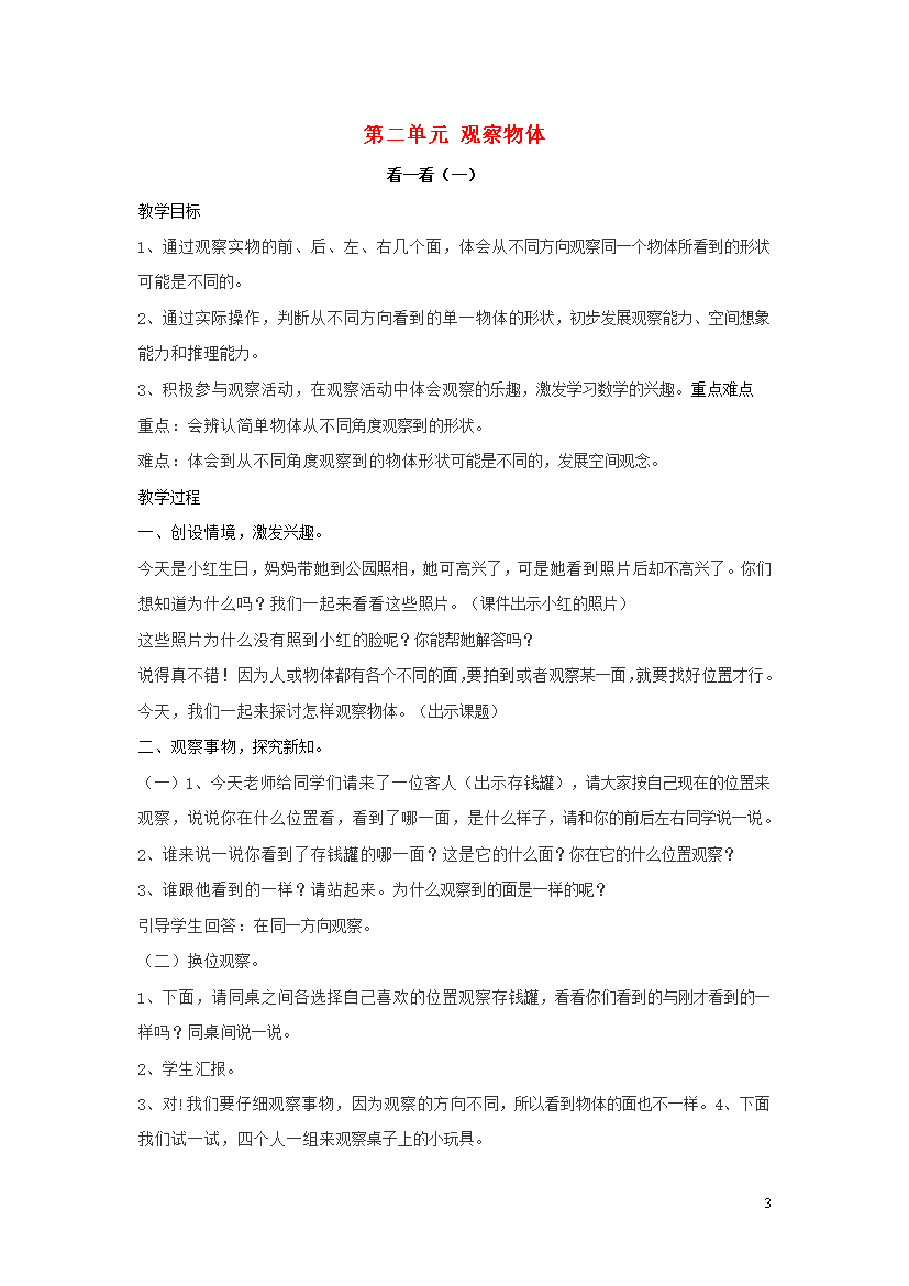 教案-全国-2019_2018-2019学年三年级数学上册 第二单元 观察物体教案 北师大版
