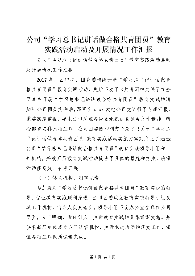 公司“学习总书记讲话做合格共青团员”教育实践活动启动及开展情况工作汇报