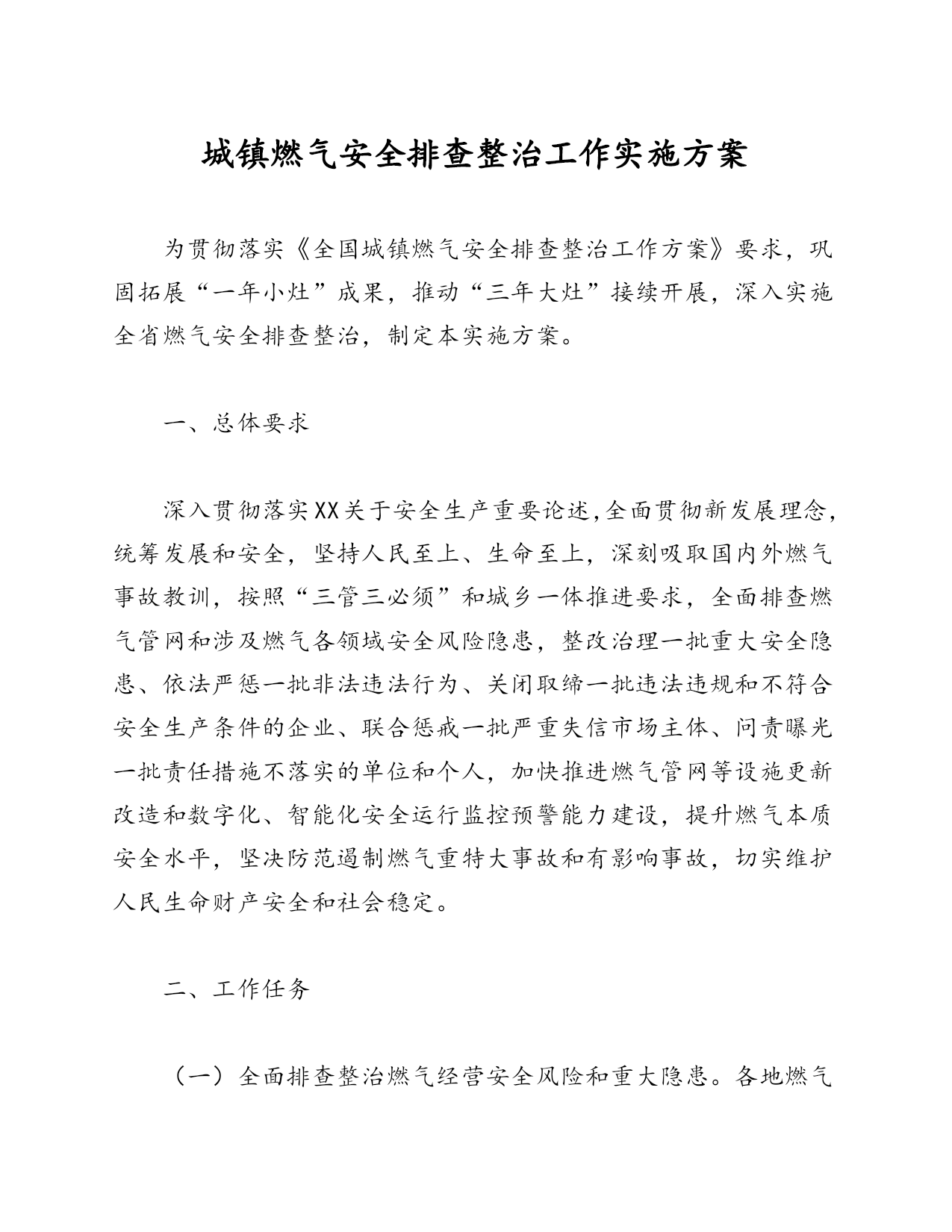 城镇燃气安全排查整治工作实施方案