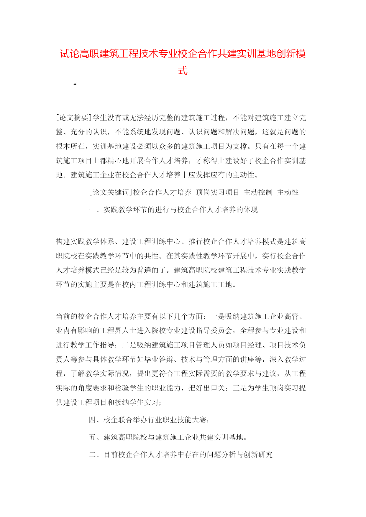 试论高职建筑工程技术专业校企合作共建实训基地创新模式