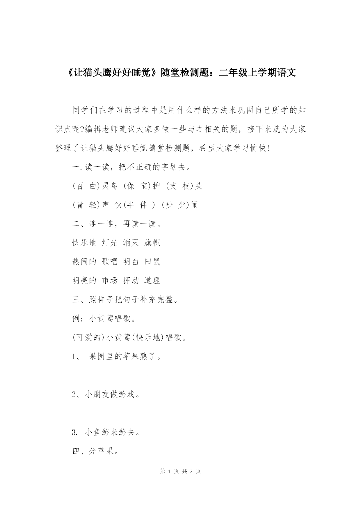 《让猫头鹰好好睡觉》随堂检测题:二年级上学期语文