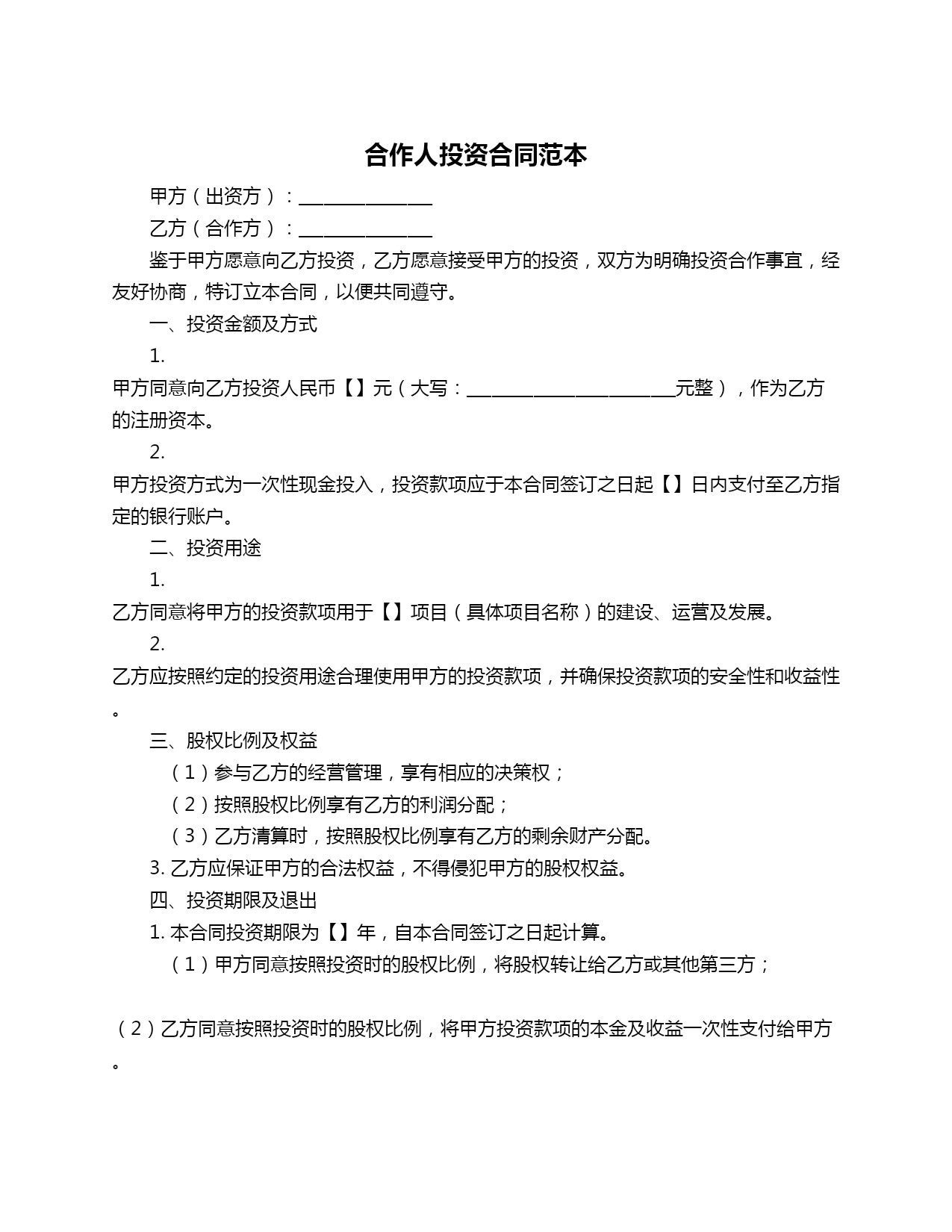 合作人投资合同范本