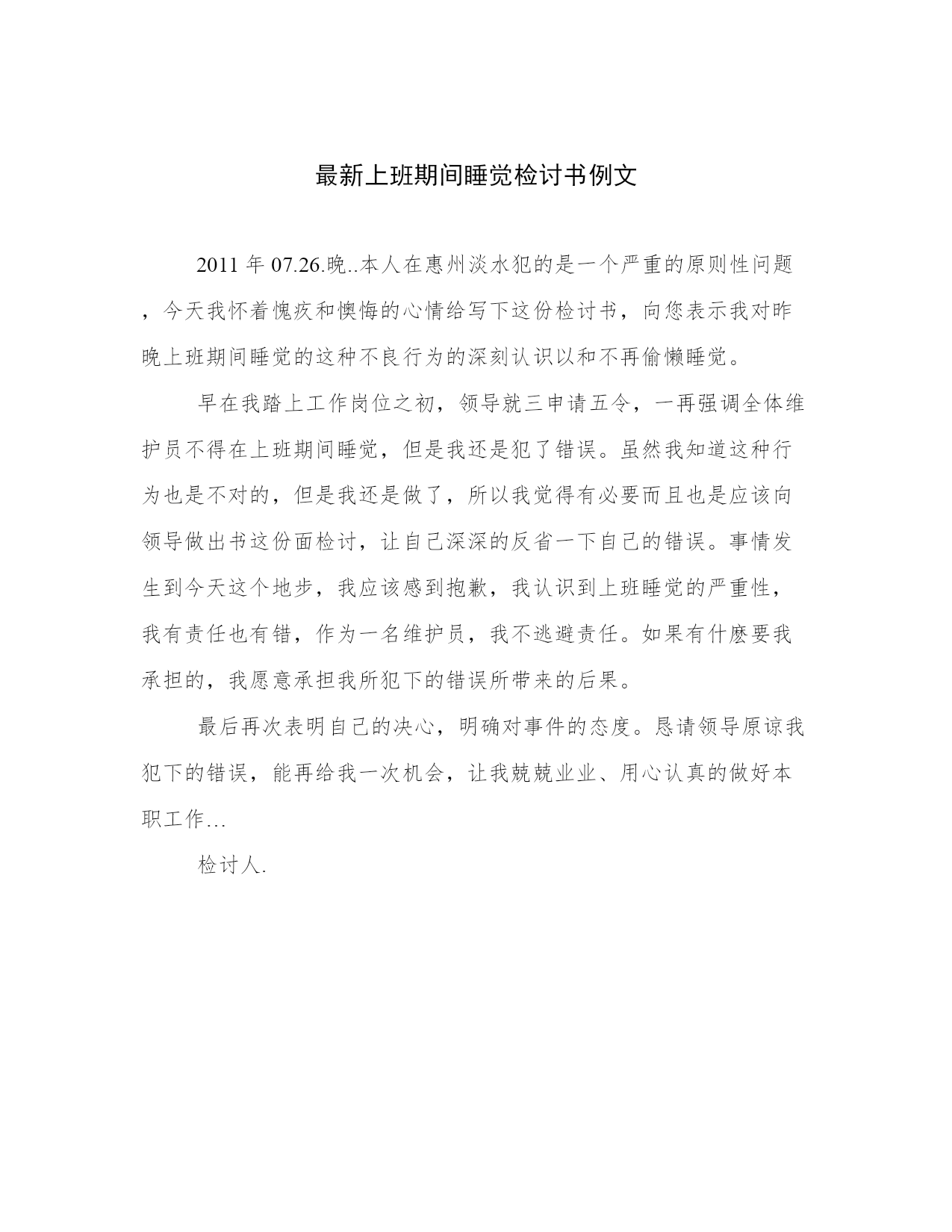 最新上班期间睡觉检讨书例文