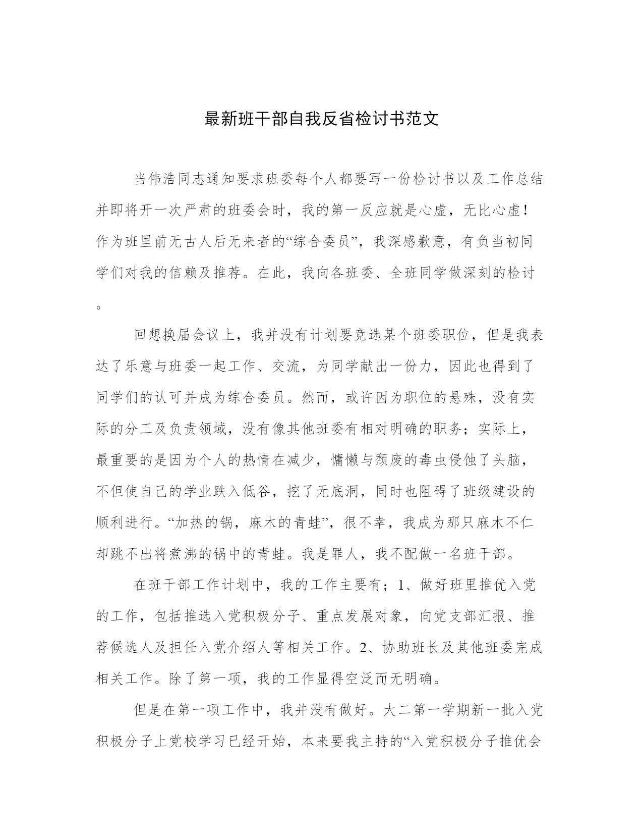 最新班干部自我反省检讨书范文