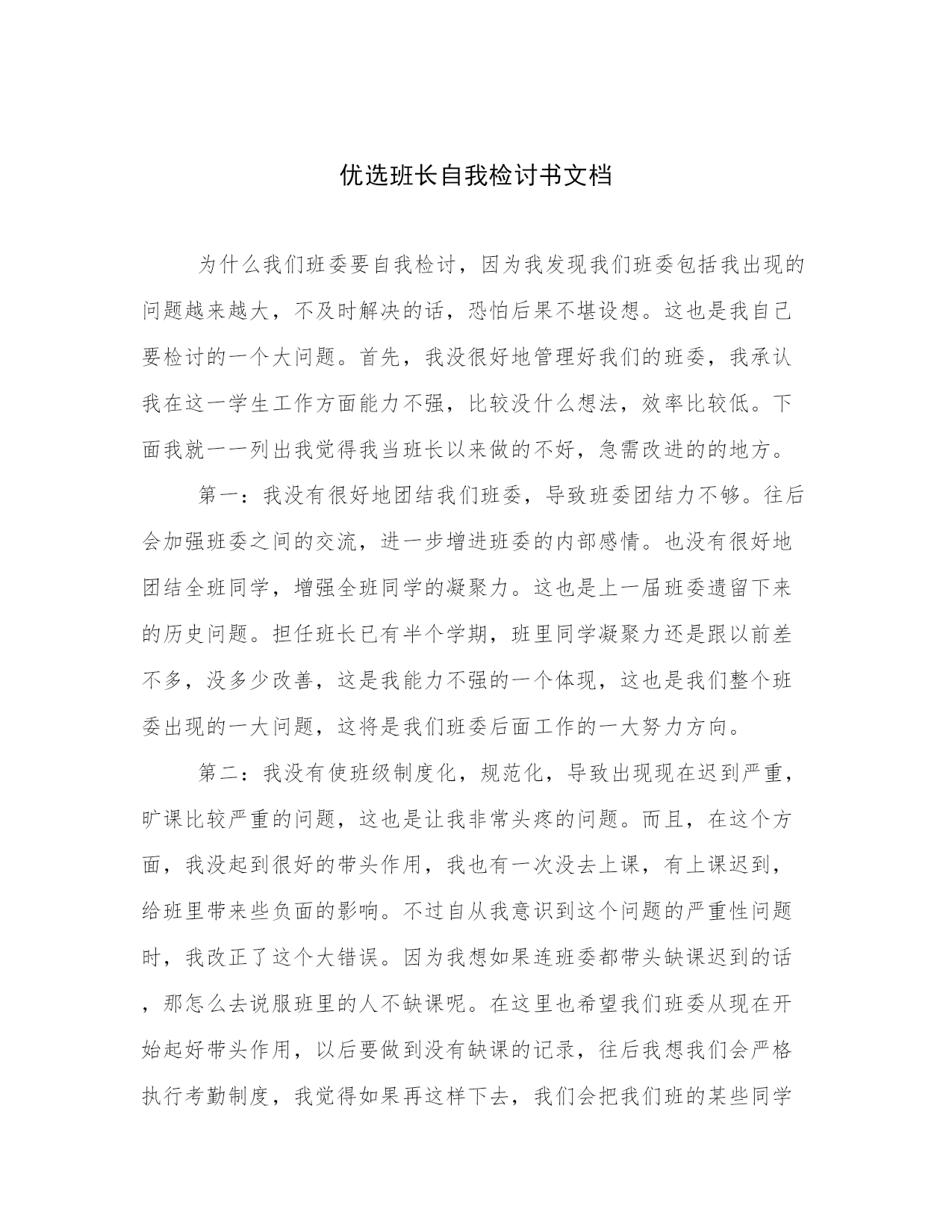 优选班长自我检讨书文档