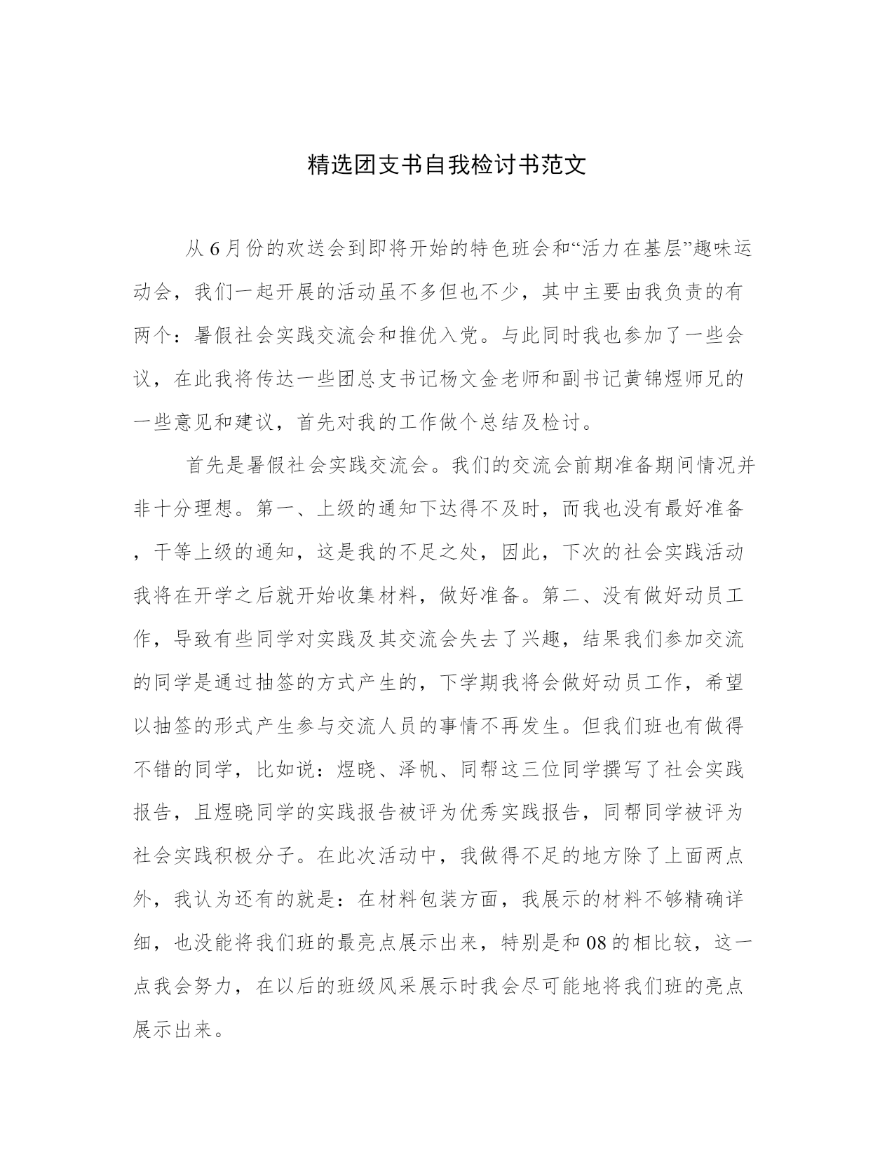 精选团支书自我检讨书范文