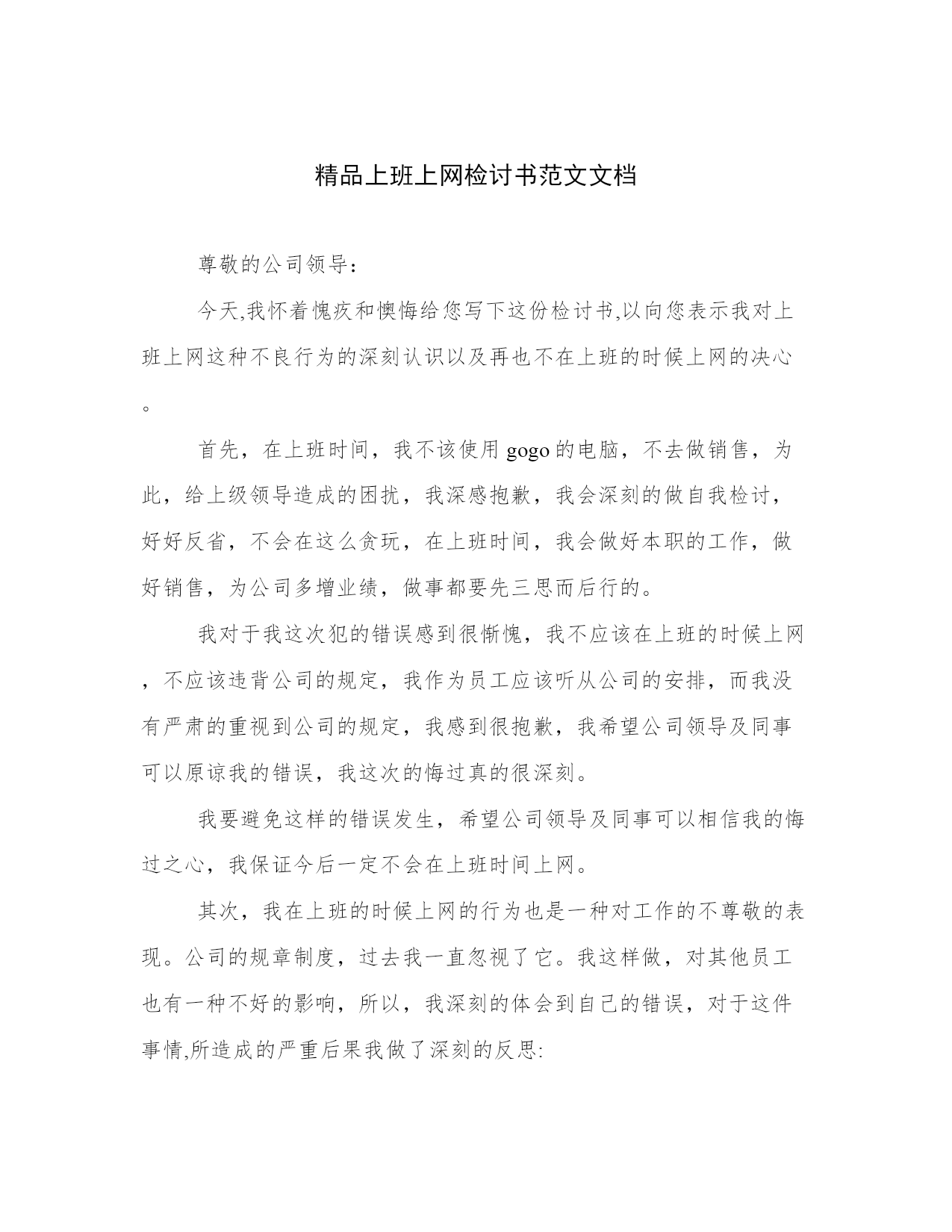 精品上班上网检讨书范文文档