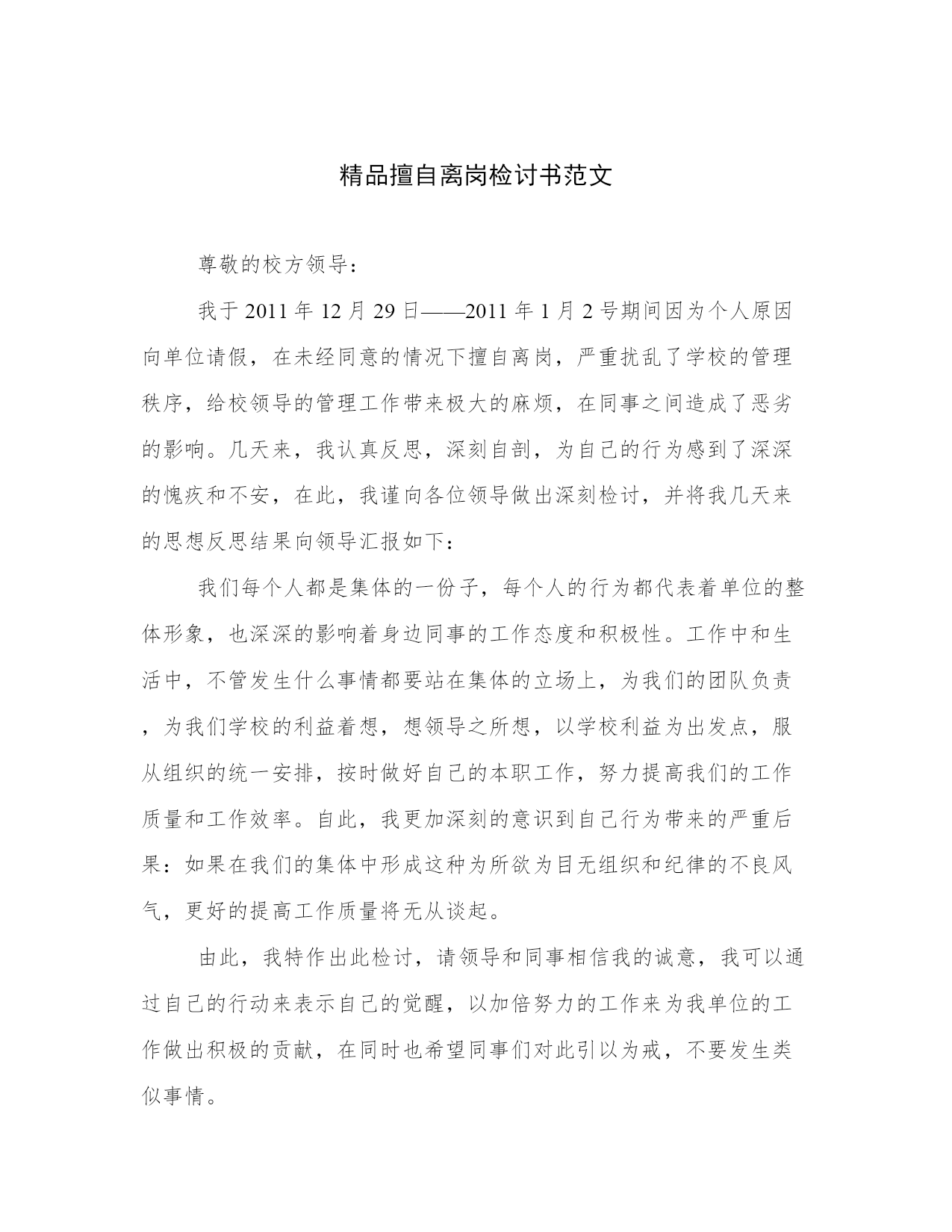 精品擅自离岗检讨书范文