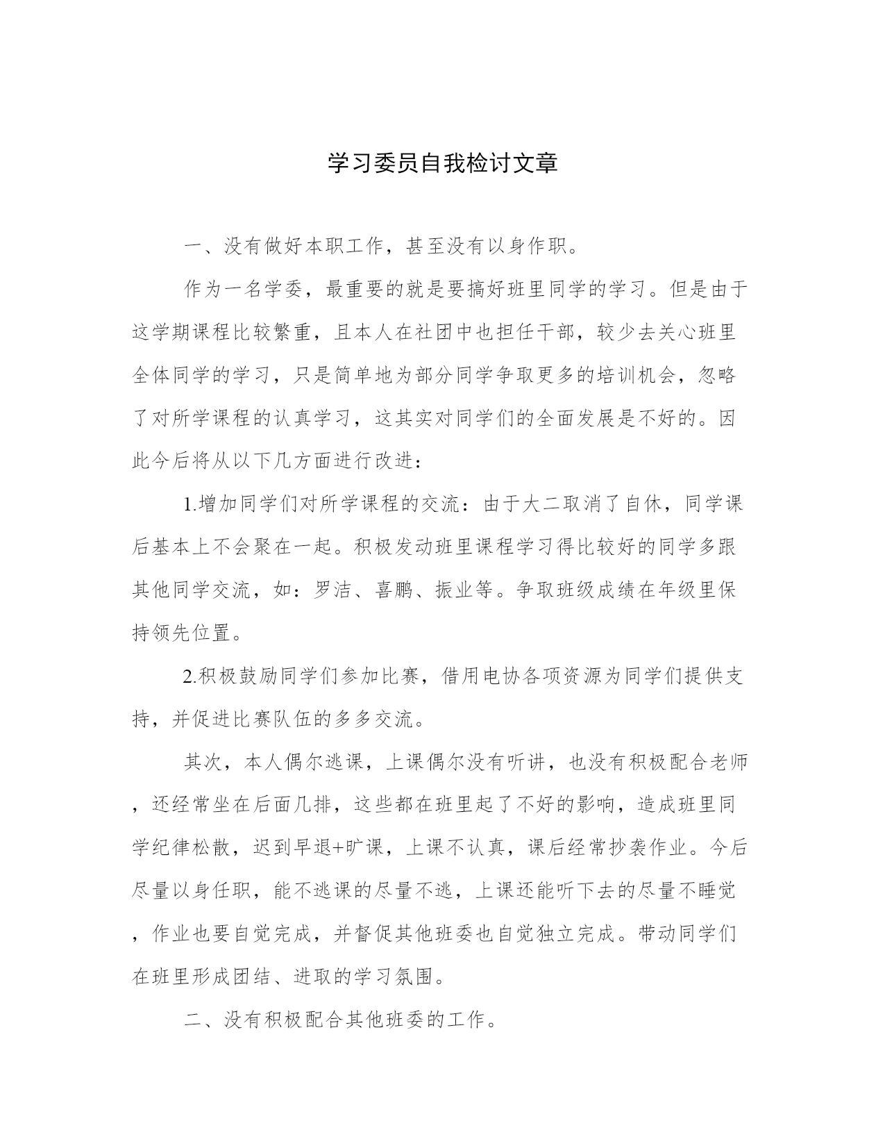 学习委员自我检讨文章