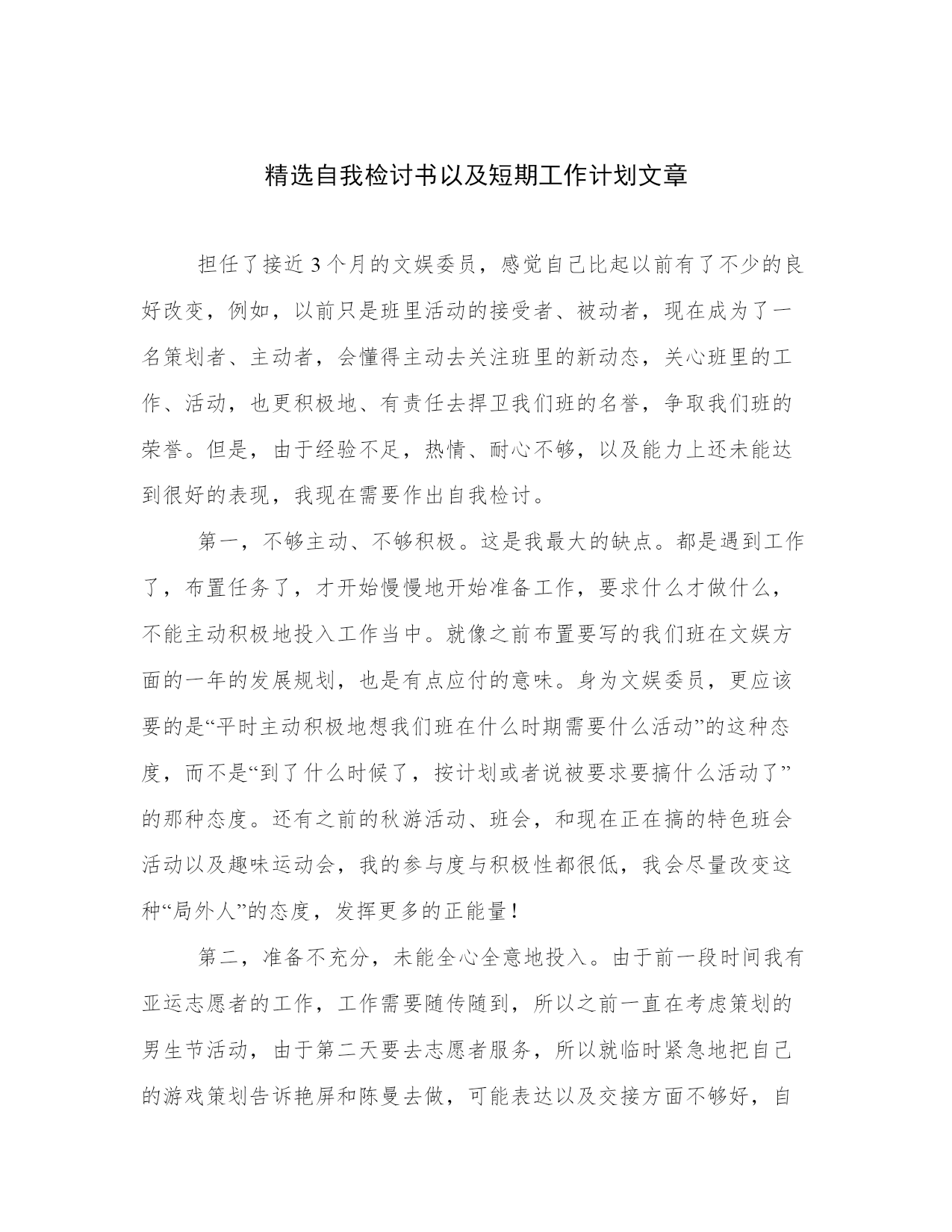 精选自我检讨书以及短期工作计划文章