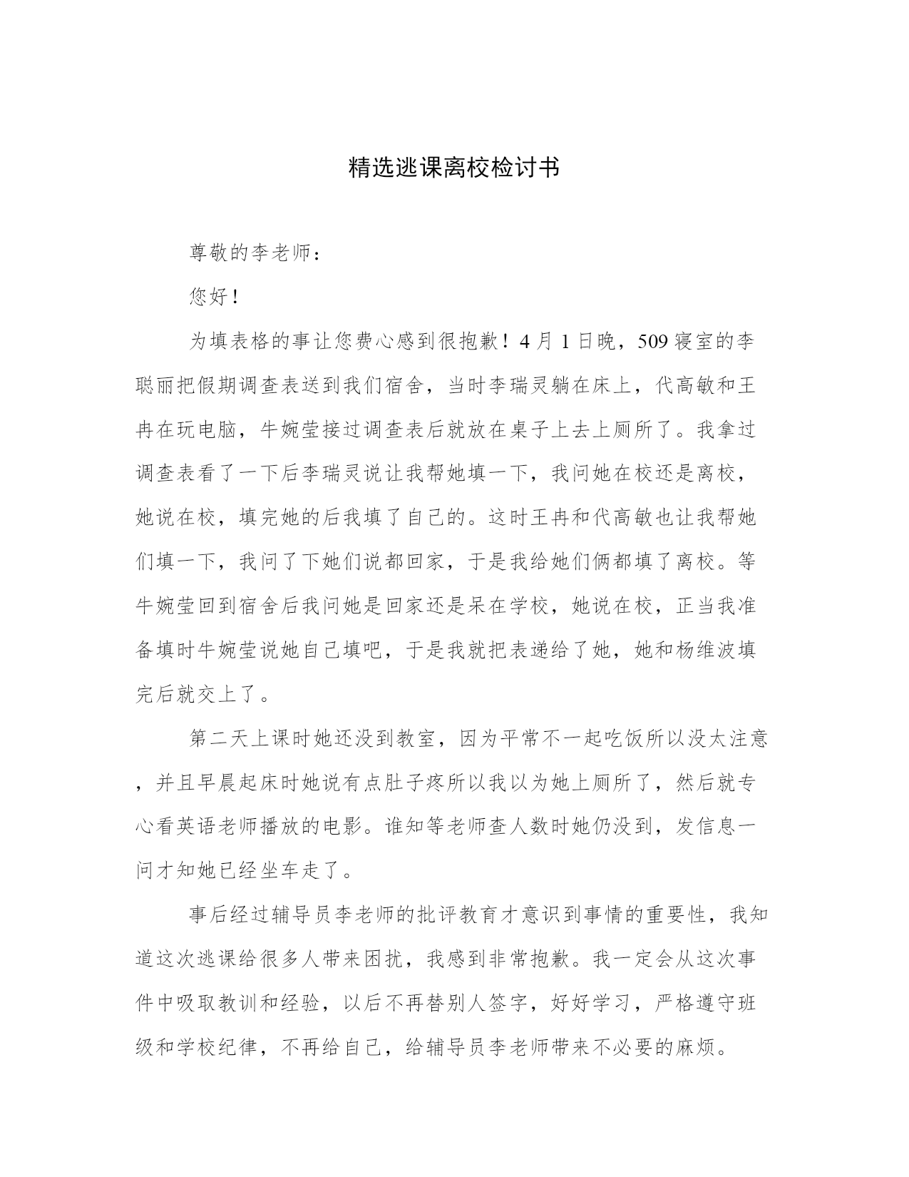 精选逃课离校检讨书