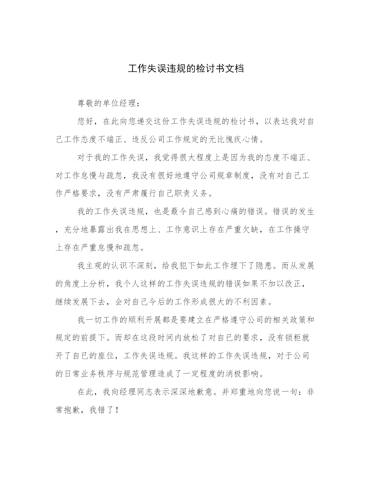 工作失误违规的检讨书文档