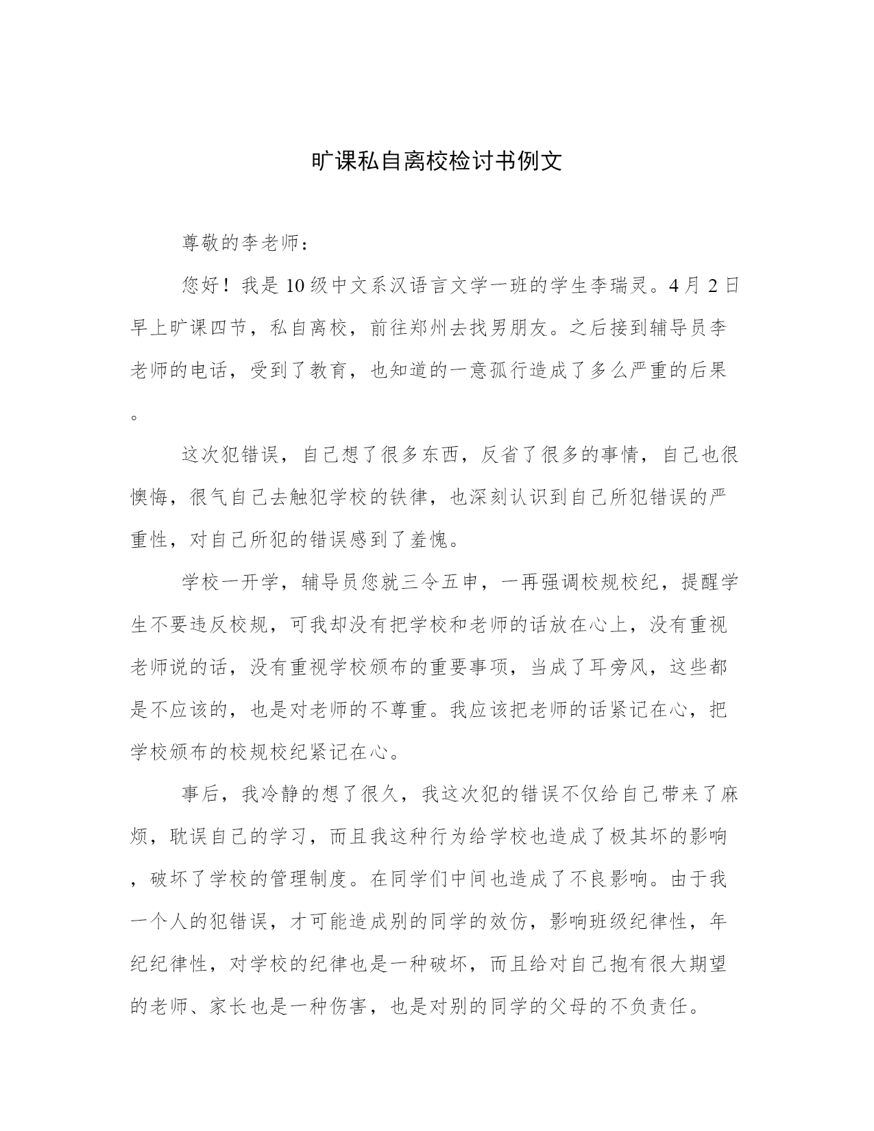 旷课私自离校检讨书例文