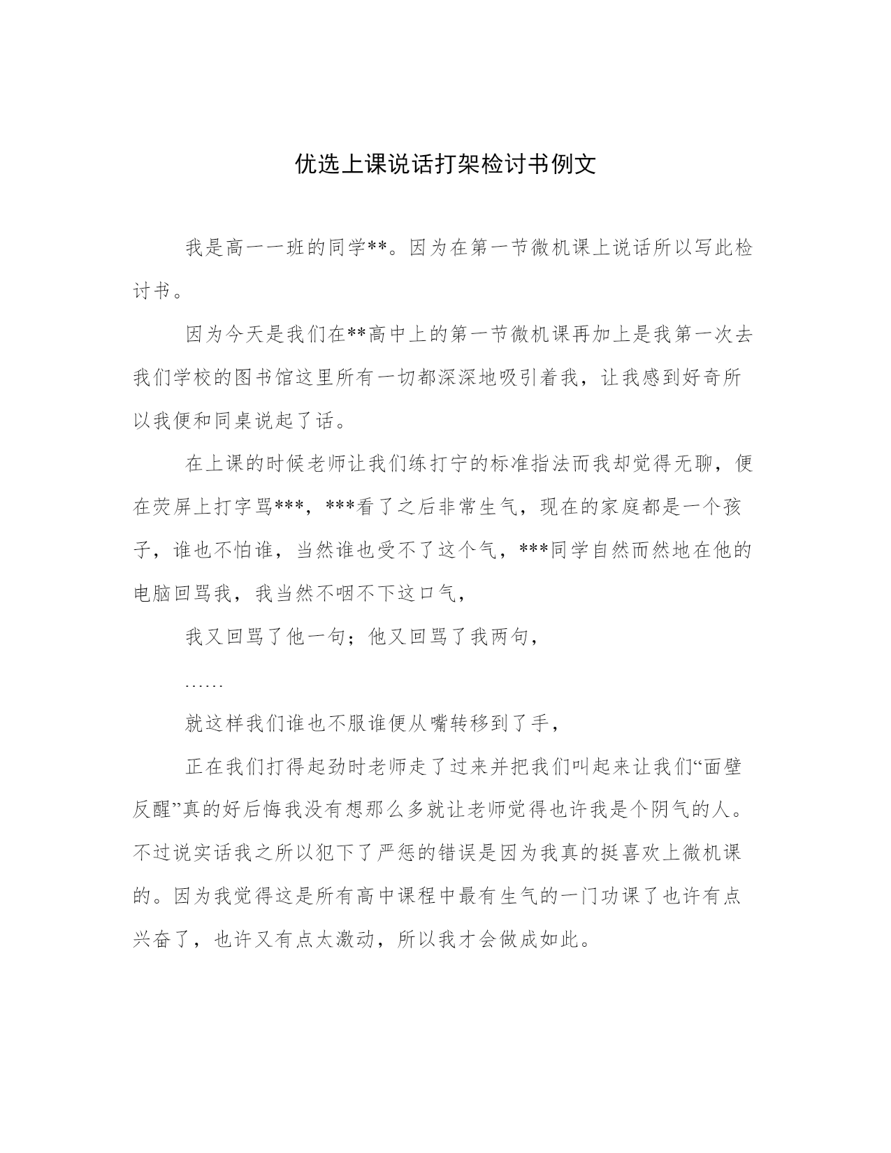 优选上课说话打架检讨书例文
