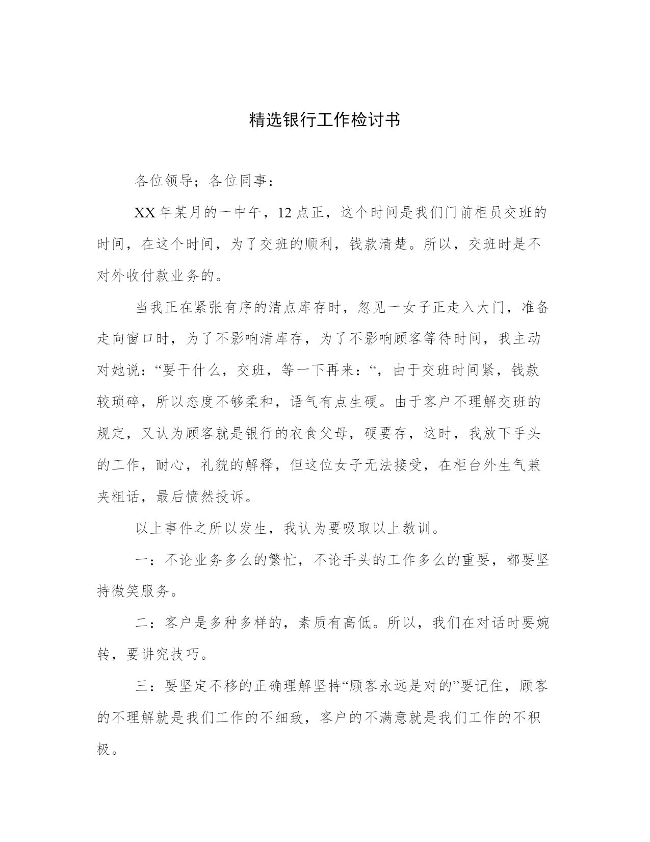 精选银行工作检讨书