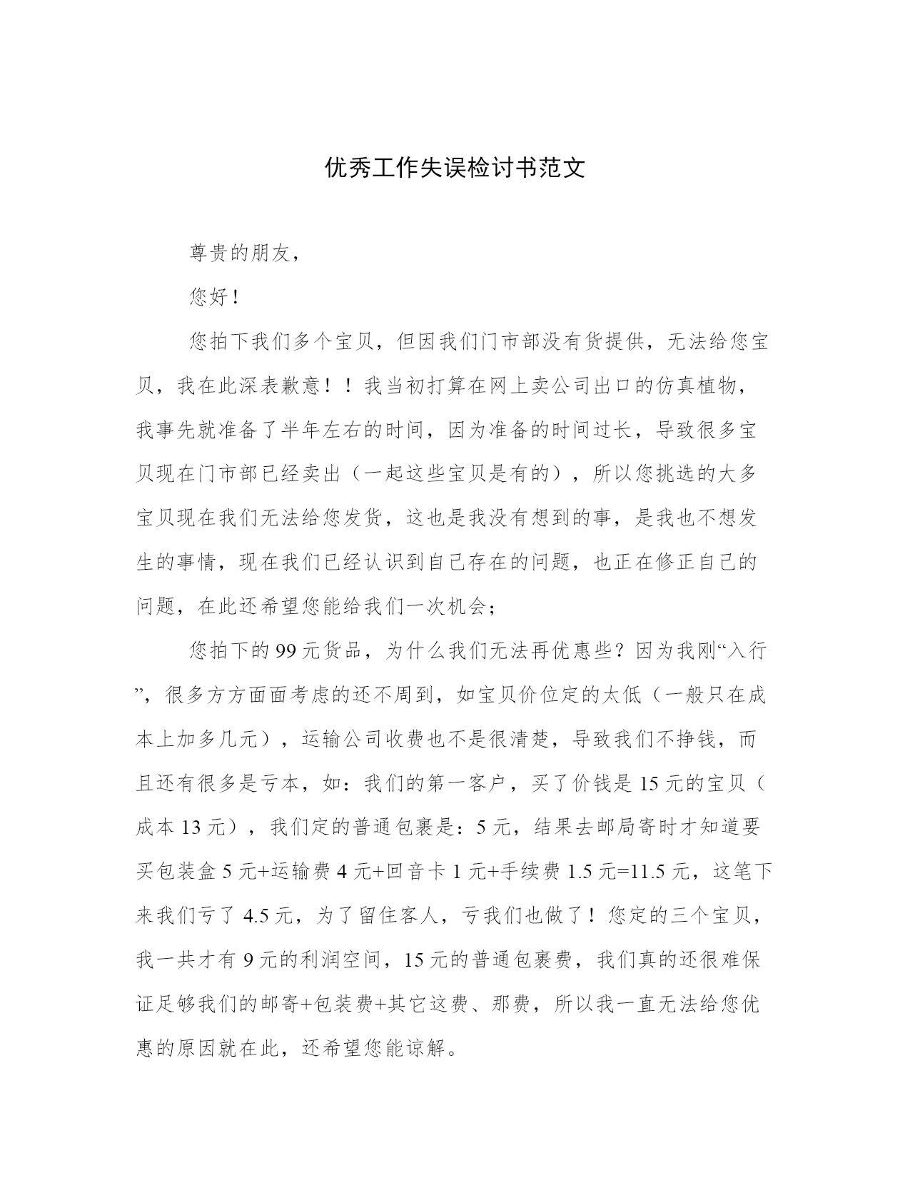 优秀工作失误检讨书范文