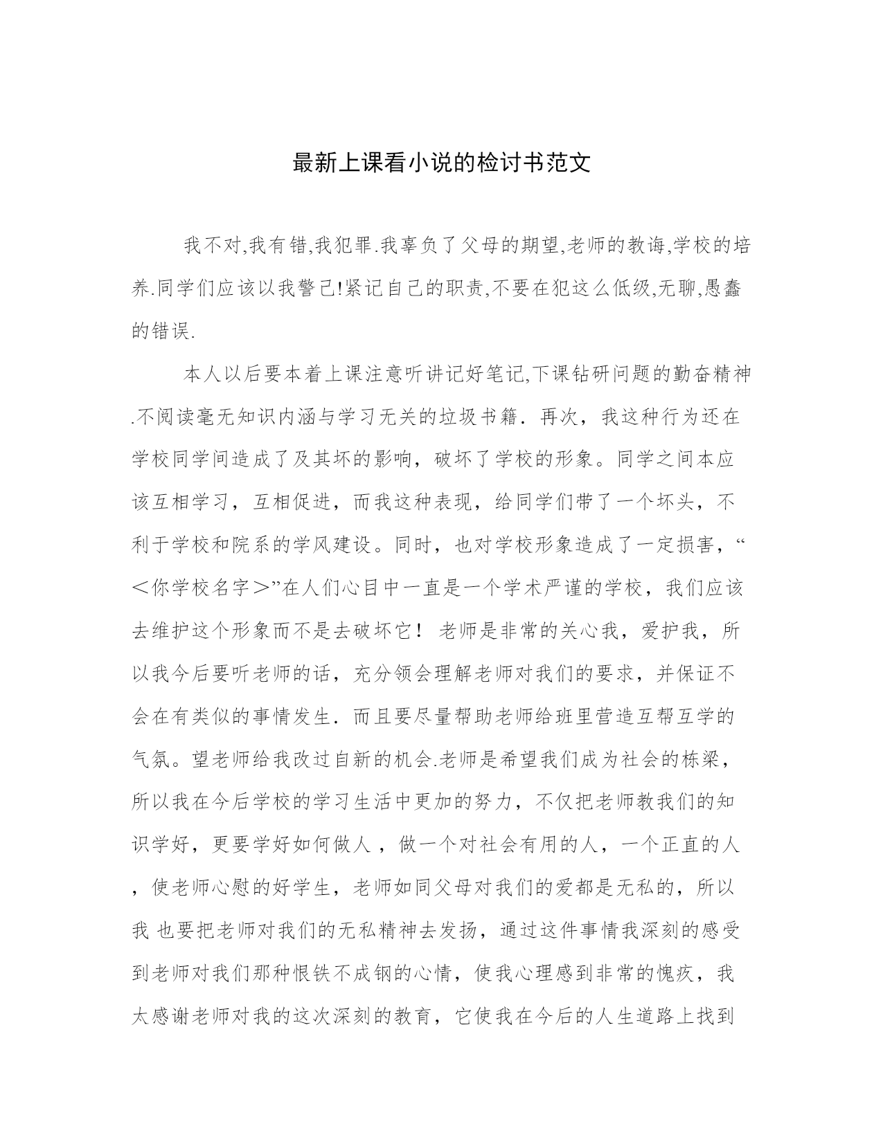 最新上课看小说的检讨书范文