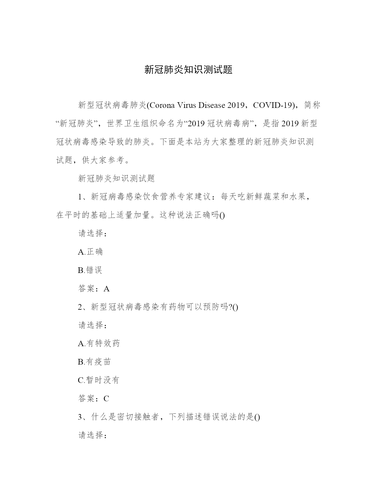 新冠肺炎知识测试题