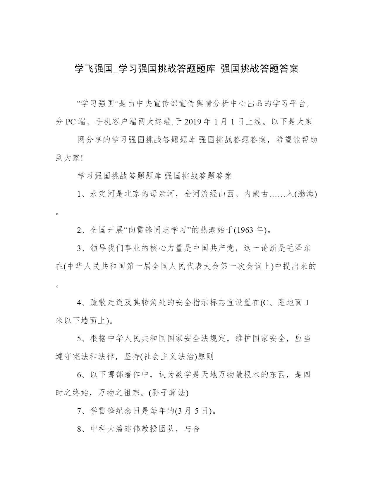 学飞强国_学习强国挑战答题题库 强国挑战答题答案