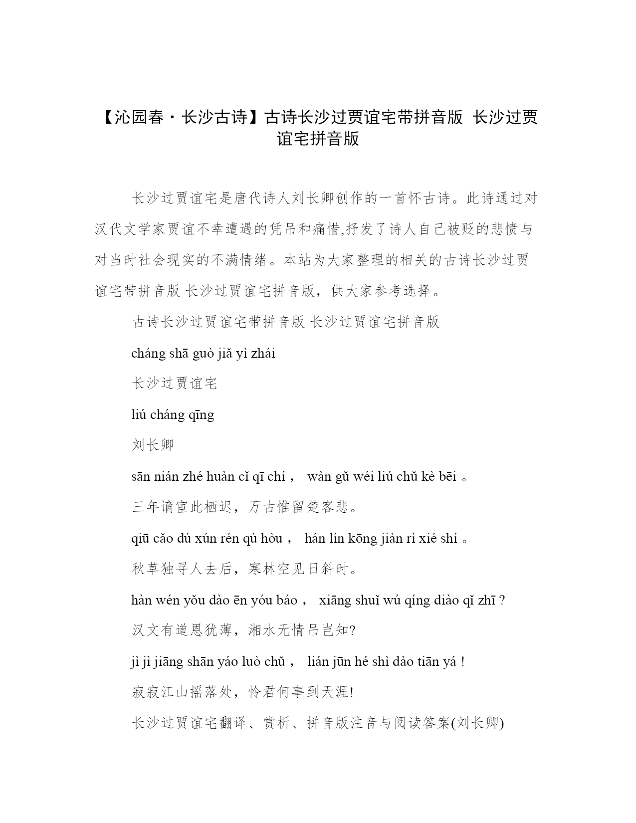 【沁园春·长沙古诗】古诗长沙过贾谊宅带拼音版 长沙过贾谊宅拼音版