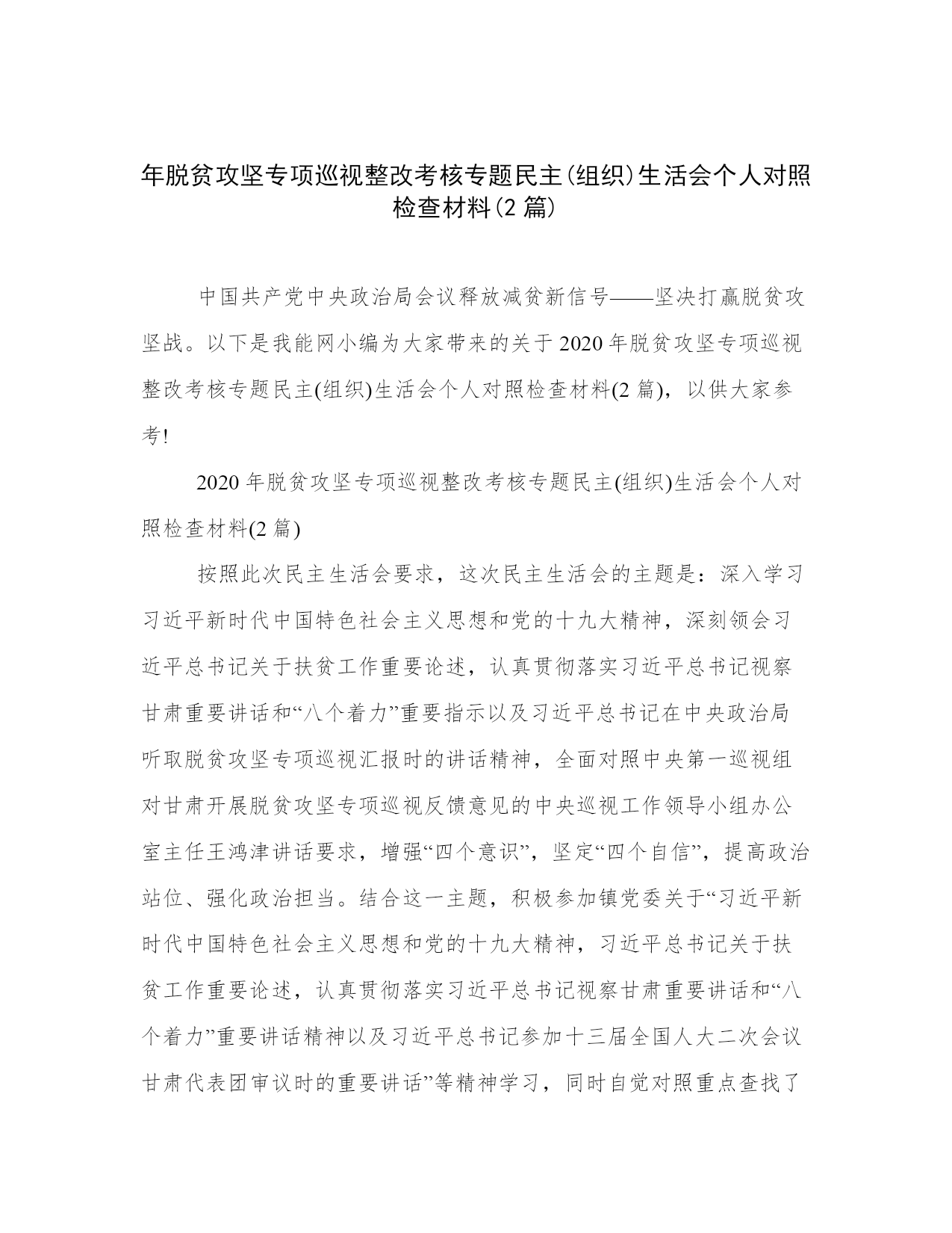 年脱贫攻坚专项巡视整改考核专题民主(组织)生活会个人对照检查材料(2篇)