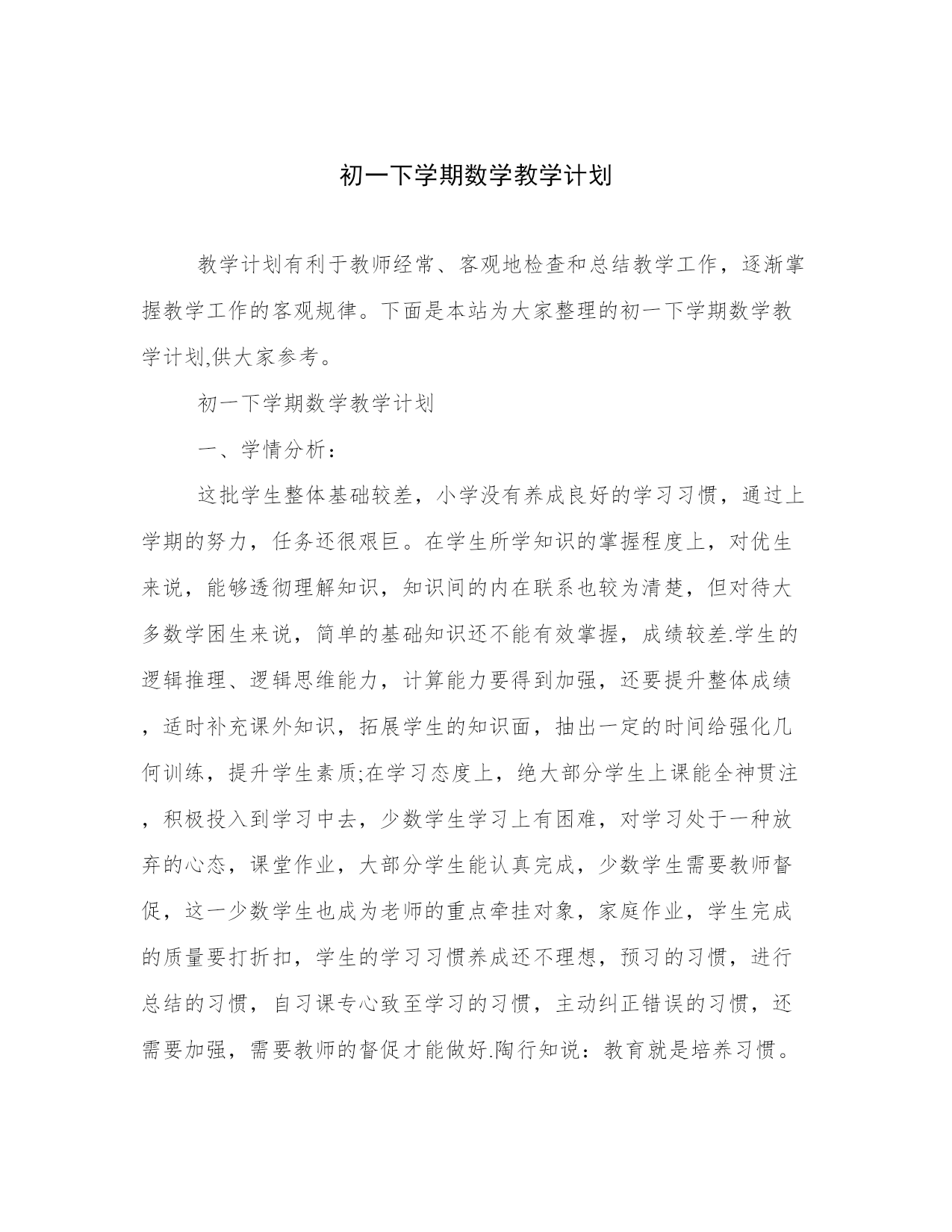 初一下学期数学教学计划