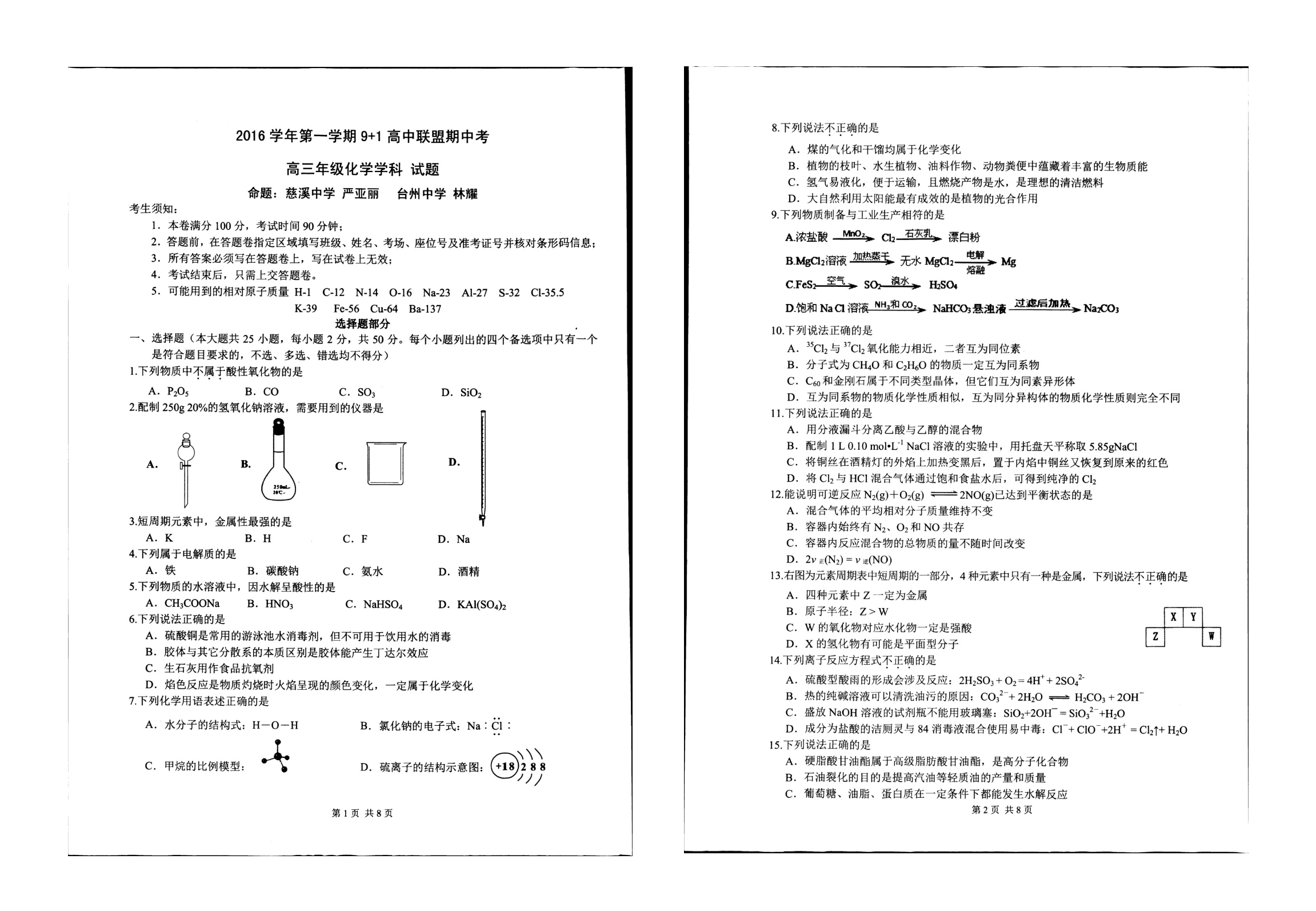 2016学年度第一学期91高中联盟化学试题、参考答案、答题卷(8K)