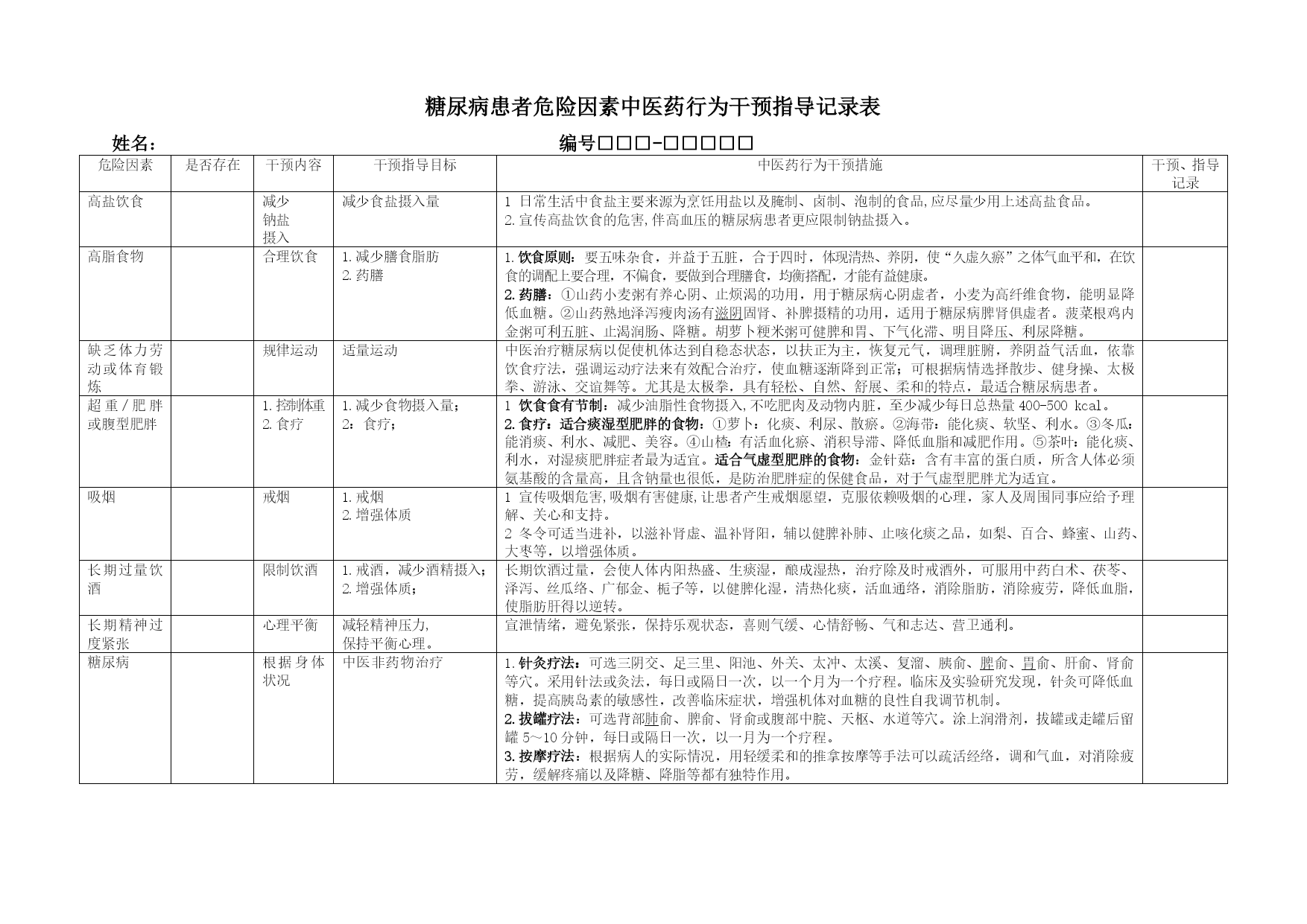 糖尿病患者危险因素中医药行为干预指导记录[1]