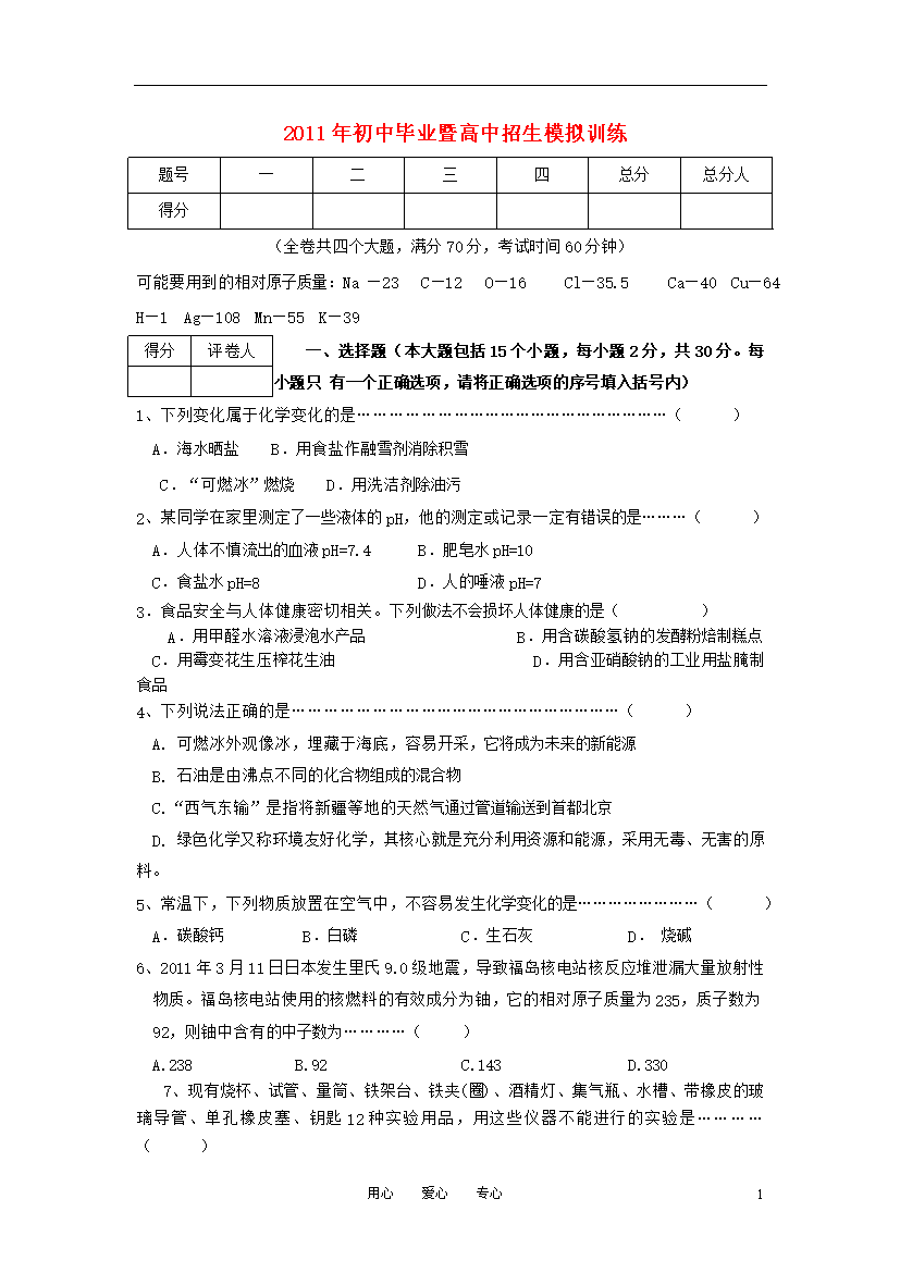 试题-重庆-2011_重庆市万州区2011年中考化学模拟试题