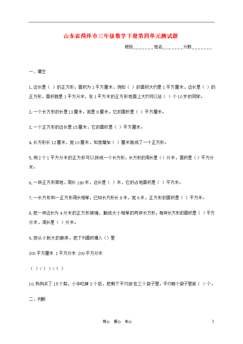 试题-山东-2011_山东省菏泽市三年级数学下册 第四单元测试题(无答案)