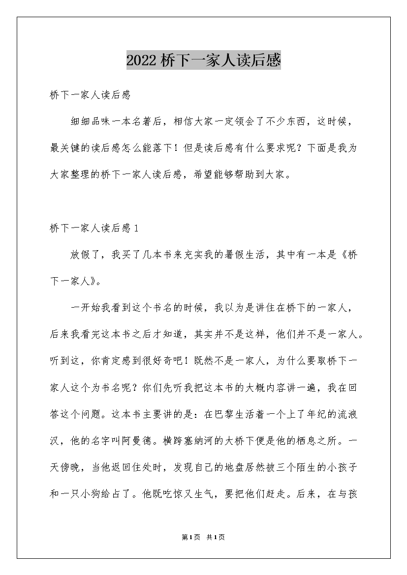 2022桥下一家人读后感